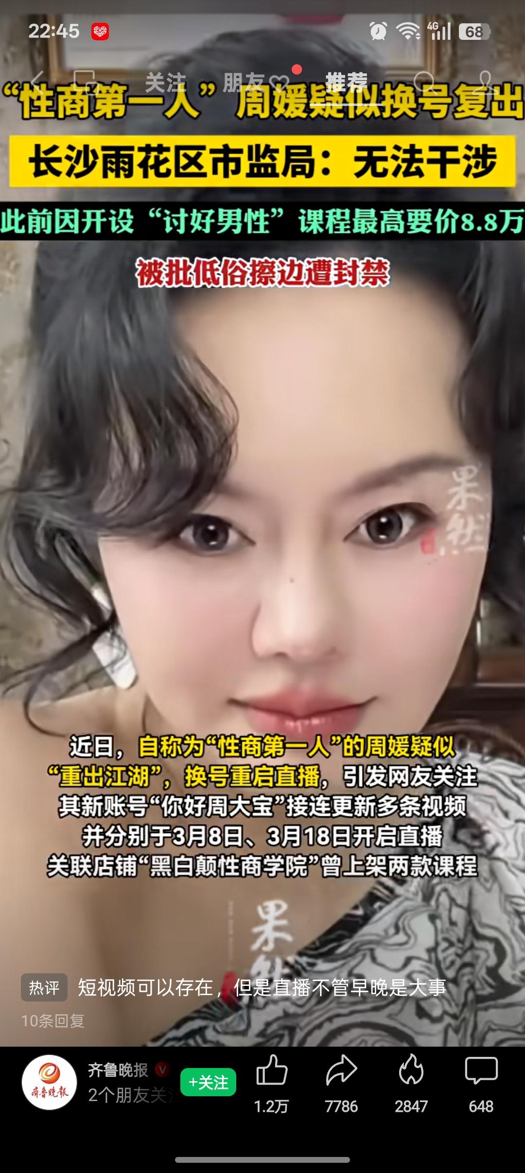 揭秘真相:“性商第一人”周媛换号复出?市监局“无法干涉”到底是什么意思? 近日,曾因开设“讨好男性”天价课程被封禁的周媛,疑似换号“你好周大宝”重启直播,关联店铺“黑白颠性商学院”还上架了课程,长沙雨花区市监局一句“无法干涉”,瞬间引爆全网争议。今天就把事件全貌、法律边界和争议核心彻底讲透。 一、事件还原:从“讨好男性”天价课到换号复出 周媛的争议并非首次: - 此前风波:她自称“性商第一人”,开设所谓“讨好男性”课程,最高定价8.8万元,内容充斥低俗擦边、物化女性的价值观,被网友举报后,原账号遭平台封禁; - 疑似复出:近日新账号“你好周大宝”更新多条视频,两次开启直播,关联店铺上架课程,被网友扒出是周媛换号“重出江湖”; - 官方回应:长沙雨花区市监局表示“无法干涉”,这一说法直接点燃网友怒火,质疑“监管缺位,放任低俗内容传播”。 二、核心真相:市监局“无法干涉”,不是不管,是权责边界问题 很多网友误解“无法干涉=放任不管”,实则是对监管权责的认知偏差: 1. 监管权责分野清晰 - 市监局:核心监管范围是市场经营行为,比如虚假宣传、价格违法、无证经营等。若周媛的课程存在虚假宣传、天价收费违规,市监局可依法查处;但内容低俗、价值观问题,不属于市监局的法定监管范畴。 - 网信/文旅/广电部门:负责网络内容生态监管,低俗擦边、违背公序良俗的内容,由网信部门牵头整治,平台也有内容审核的主体责任。 - 平台责任:账号封禁、内容审核是平台的核心义务,周媛换号复出,本质是平台审核是否到位的问题,而非市监局的监管盲区。 2. “无法干涉”的真实含义 市监局的回应,是明确自身权责边界:对于内容价值观层面的问题,市监局没有执法权限,无法直接干预账号运营、内容发布,并非“不管”,而是“管不了”,真正的监管主体是网信部门和平台。 3. 课程本身的法律风险 周媛的“性商课”若存在以下情况,相关部门可依法查处: - 虚假宣传、夸大课程效果,涉嫌违反《广告法》《反不正当竞争法》; - 天价收费、无资质办学,涉嫌违反《价格法》《民办教育促进法》; - 内容低俗、传播物化女性的价值观,违反《网络安全法》《网络信息内容生态治理规定》,网信部门可责令整改、封禁账号。 三、争议本质:不是监管缺位,是价值观的底线之争 这场风波的核心,从来不是“市监局管不管”,而是低俗价值观能否在网络空间肆意传播: - 周媛的课程,本质是把女性物化、把亲密关系异化为“讨好男性的工具”,传递的是扭曲的婚恋观、价值观,严重违背公序良俗; - 换号复出的行为,本质是钻平台审核的空子,用“换马甲”的方式规避监管,挑战内容生态的底线; - 网友的愤怒,本质是对“低俗内容屡禁不止、换号就能复活”的不满,是对监管和平台压实责任的诉求。 四、总结:“无法干涉”不是免责,监管和平台都不能缺位 周媛换号复出事件,真相清晰: - 市监局“无法干涉”,是权责边界的明确,而非监管缺位; - 真正该担责的,是平台的内容审核,和网信部门的内容监管; - 低俗擦边、物化女性的课程,绝不能以“性商”为名肆意传播,更不能换个马甲就卷土重来。 网络不是法外之地,价值观更有底线。无论是平台还是监管部门,都不能让低俗内容有可乘之机,这才是对公众最基本的负责。