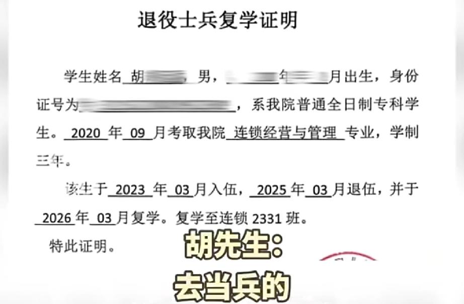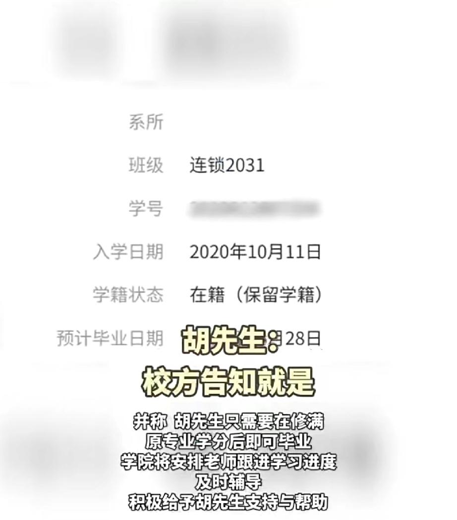胡先生系常州纺织服装职业技术学院连锁经营管理专业学生,于2020年9月入学就读该专业,2023年3月处于大三实习阶段时应征入伍。2025年3月胡先生退伍返校申请复学时,发现其所就读的连锁经营管理专业,已于2022年停止招生并正式撤销。学校初期拟定处理方案为安排其转入市场营销专业,并需补修相关课程,该方案或将导致其毕业时间延迟。 此事经荔枝新闻《政风热线》关注跟进后,学校高度重视并重新研判处置方案,于2026年3月27日依规为胡先生办理完成复学手续,明确胡先生继续按照原连锁经营与管理专业培养方案完成剩余学业。 具体处置解决方案如下:一是学业规划方面,胡先生需按照原专业人才培养要求,修满规定学分,完成毕业设计及各项考核环节,考核合格后,将颁发原专业毕业证书,最快可于2026年6月正常毕业;二是学业保障方面,学院安排专职教师对接跟进其学习进度,为其提供针对性专项学业辅导,全力保障其学业任务顺利推进。