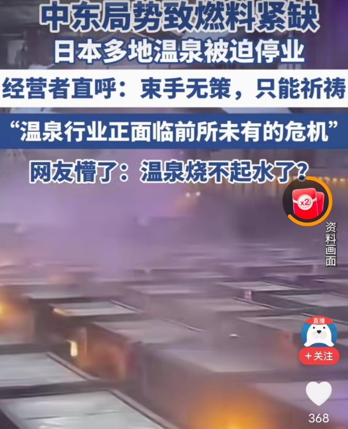 因中东战事,日本温泉行业被迫停业,以前说日本火山多温泉是天然的,没想是用天燃气烧的,这不是北方的大澡堂子吗?被骗去日本泡温泉的有钱人懵了。 最近这事儿在日本闹得沸沸扬扬,青森、岐阜、大阪、兵库这些地方,一家家开了几十年的温泉旅馆接二连三贴出告示:暂停营业。理由出奇地一致 —— 没燃料了,锅炉烧不热,温泉水变凉水,没法接待客人。 这事一爆出来,那些花大价钱去日本泡汤的游客瞬间就懵了。 印象里,日本处在板块交界处,火山多、地热足,温泉不就是地下自己冒出来的热水吗?怎么还需要烧锅炉? 合着我们花几万块飞过去,住一晚几千块的温泉酒店,泡的不是什么天赐的地热温泉,而是用重油、天然气烧开的 “锅炉水”? 这不跟咱们东北、华北老家的大澡堂子一个路数,只不过包装得更精致、卖得更贵罢了。 这事说穿了其实一点不复杂,日本的温泉,早就不是我们想象中那种纯天然的模样了。 根据日本温泉协会和业内的数据,全国超过 1.3 万家温泉旅馆、浴场,真正能做到纯天然涌出、不加热、不循环、不兑水的,连 10% 都不到。剩下的绝大多数,都得靠人工 “伺候”。 要么是地下抽出来的泉水温度不够,比如只有 30 度出头,达不到人体舒适的 40 度以上,必须得用锅炉加热。要么就是泉眼出水太少,不够一池子用,得掺自来水,再加热循环使用。 还有些所谓的 “温泉”,干脆就是自来水加矿物质粉、加药包,再用锅炉烧热,美其名曰 “人工温泉”。 所以,日本温泉能泡得热乎乎、舒舒服服,背后全是化石燃料在顶着。 以前大家不知道,商家也不主动说,都拿 “火山恩赐”“天然养生” 当噱头,把价格抬得老高。 现在中东一打仗,燃料断供、价格飞涨,这层遮羞布直接被扯了下来,原来精致的日本温泉,本质上就是个高配版、天价版的 “大澡堂”。 为啥中东战事能直接掐断日本温泉的 “热气”?根子就在日本的能源命门太脆弱了。 日本是个资源穷国,石油、天然气几乎全靠进口,而其中超过 95% 的原油,都来自中东地区。 什么沙特、伊拉克、阿联酋、卡塔尔,日本的能源生命线,全绑在霍尔木兹海峡这条窄窄的水道上。 2026 年 2 月底以来,美国和以色列在中东对伊朗动手,局势彻底乱了。伊朗直接放出话来,要封锁霍尔木兹海峡,来往的油轮、LNG 船要么不让过,要么就得冒巨大风险。 这条道一封,日本的能源供应立马告急。原油进不来,由原油提炼的重油就成了稀缺货。 而重油,正是日本温泉锅炉最主要的燃料。像岐阜县那家挺有名的池田温泉,一天就要烧掉 1400 升重油,才能把泉水从 30 多度加热到 40 多度。 结果呢?中东局势一紧张,重油价格一个月连涨 4 次,有钱都未必买得到货。池田温泉库存只够烧两天,只能无奈关门。 不光是温泉,日本的发电、工业、民生全受影响。政府急得没办法,只能启动国家石油储备,一口气放出 8000 万桶,相当于日本 45 天的用量,创了历史纪录。 可这也是杯水车薪,储备总有见底的时候,只要中东局势不平复,海峡不通畅,日本的能源荒就好不了。 这事也给所有人提了个醒:很多看似高端、精致、有格调的东西,背后往往藏着最朴素、最现实的逻辑。 日本温泉的神话,本质上就是一场建立在化石燃料之上的精致生意。当能源供应链断裂,再美的包装、再动听的故事,都撑不起一池热水。
