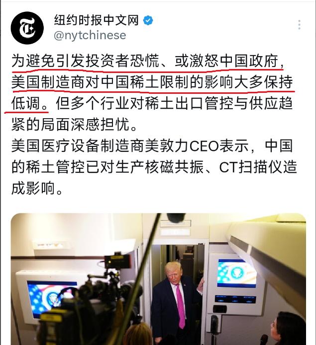 纽约时报中文网4月3日写道:“为避免引发投资者恐慌、或激怒中国政府,美国制造商对中国稀土限制的影响大多保持低调。但多个行业对稀土出口管控与供应趋紧的局面深感担忧。美国医疗设备制造商美敦力CEO表示,中国的稀土管控已对生产核磁共振、CT扫描仪造成影响。” 纽约时报中文网的报道,把美国企业那种 “敢怒不敢言” 的窘迫摆上了台面 —— 一边怕说多了惹怒中国,断了最后的供应渠道;一边又怕瞒不住,导致股价跳水、投资人用脚投票。 这种左右为难的尴尬,恰恰说明中国的稀土管控,已经精准戳中了美国经济的要害,不是远在天边的贸易摩擦,而是近在眼前、切切实实的生产停摆危机。 稀土不是 “土”,是 17 种稀有金属元素的统称,被称作现代工业的 “维生素”。听起来玄乎,落到生活里就是谁都离不开的东西。 手机震动马达、相机镜头、电动车电机、空调压缩机,全得靠稀土做的高性能磁铁。 到了高端领域,像医院里的核磁共振、CT 扫描仪,要生成清晰影像,核心部件必须用稀土材料;美军的 F-35 战机、导弹制导系统、航母电子设备,离了稀土直接变成废铜烂铁。 可以说,从民生医疗到国防军工,从日常电子到尖端科技,整个现代工业体系的运转,都绑在稀土这条供应链上。 而中国,就是全球稀土领域绝对的 “话事人”。美国地质调查局公开资料显示,中国掌控着全球 60% 以上的稀土开采量,更关键的是,全球 92% 的稀土精炼、分离加工产能在中国。 这意味着,别的国家哪怕挖出稀土矿,不送到中国提纯加工,根本变不成能用的工业原料。 美国自己不是没稀土矿,加州的芒廷帕斯矿早就重启了,但挖出来的矿石,之前还得千里迢迢运到中国加工,再买回去用。 这种 “采矿在美、加工在中国” 的畸形格局,注定了美国从根上就被掐着脖子。 中国的稀土出口管制,不是突然搞一刀切,而是一步步收紧、越来越精准。 早在 2025 年 4 月,商务部、海关总署就发布公告,对钐、钆、铽、镝等 7 类中重稀土实施出口管制,明确要维护国家安全、履行国际义务。 到 2025 年 10 月,管控进一步升级,规定只要产品里含 0.1% 以上的中国稀土,或者用了中国相关技术,出口就得申请许可证。 这条线划得很细,但刚好卡住绝大多数高端制造的脖子 —— 美敦力生产的核磁共振、CT 扫描仪,核心部件稀土含量远超 0.1%;台积电的 7nm、5nm 先进芯片,稀土成分也稳稳踩在管控线上。 美敦力 CEO 站出来发声,其实是美国整个制造业焦虑的缩影。 作为全球最大的医疗设备厂商,美敦力的产品遍布各国医院,核磁共振、CT 扫描仪更是医院的刚需设备。 现在因为稀土供应紧张、审批趋严,生产直接受影响,要么产能跟不上,要么成本暴涨,最后要么涨价、要么延迟交货。 可它不敢大张旗鼓抱怨,只能私下跟政府反映,对外尽量低调。为什么? 因为一旦把话说透,说 “没中国稀土我们造不出设备”,不仅会引发市场恐慌,更会直接激怒中国,可能连现有的一点供应都保不住。 这种 “哑巴吃黄连” 的滋味,如今正弥漫在美国各行各业。 中国的稀土管控,从来不是为了刁难谁,而是维护自身安全和发展利益的必要手段。全球供应链本就是相互依存、互利共赢的,美国总想搞单边霸权、脱钩断链,最后只会搬起石头砸自己的脚。 纽约时报中文网的这篇报道,给美国敲了一记警钟:在高度全球化的今天,没有谁能独善其身,更没有谁能永远垄断一切。