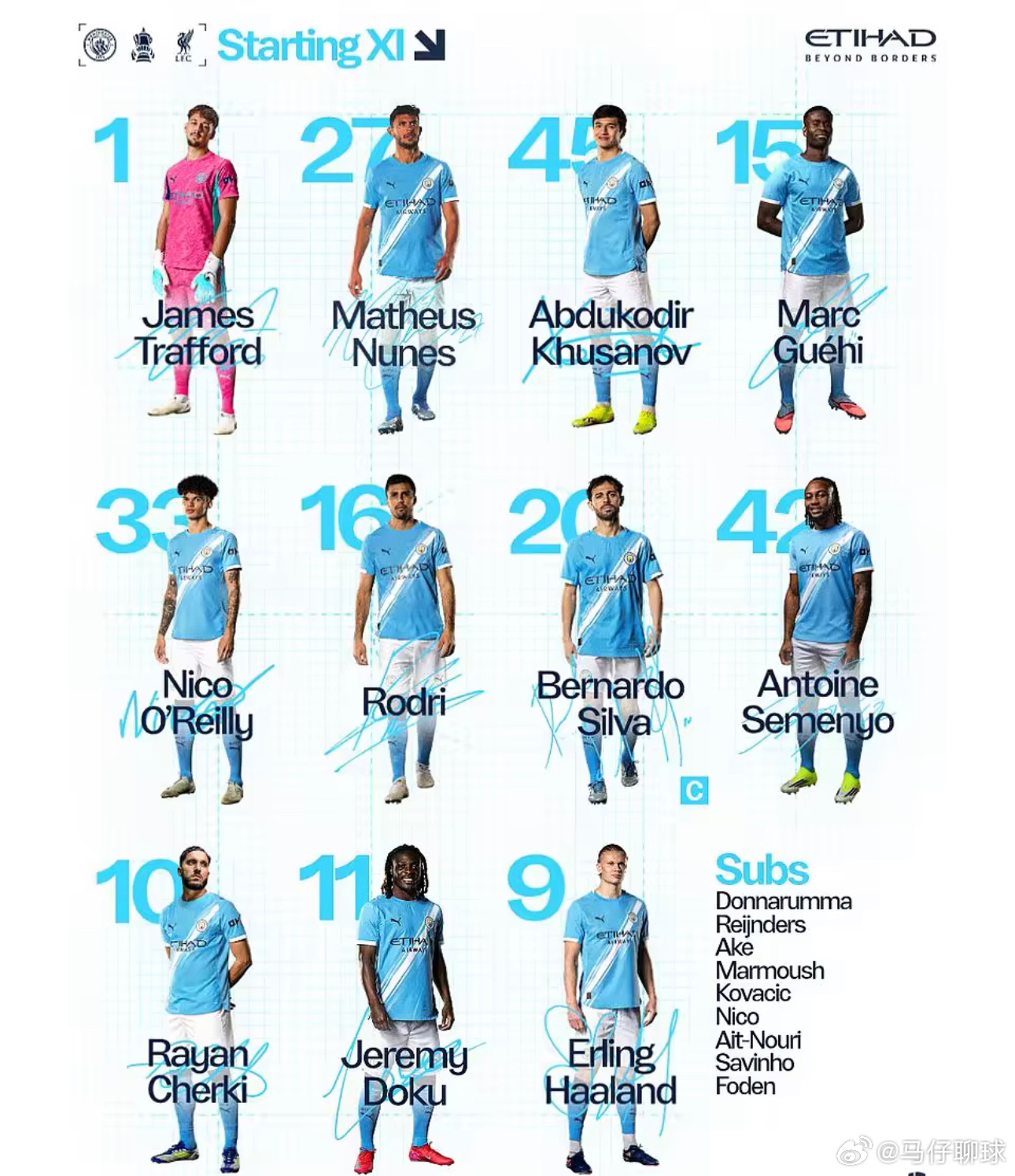 曼城首发阵容:1-特拉福德、15-格伊、27-努内斯、33-奥赖利、45-胡桑诺夫、20-B席、16-罗德里、42-塞梅尼奥、11-多库、10-谢尔基、9-哈兰德