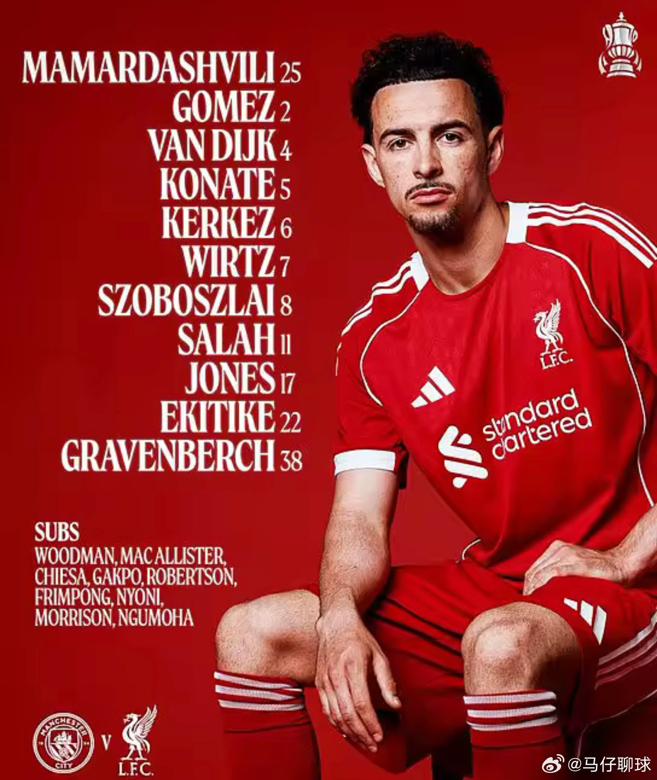 利物浦替补阵容:28-伍德曼、26-罗伯逊、30-弗林蓬、18-加克波、10-麦卡利斯特、42-尼奥尼、68-莫里森、14-基耶萨、73-恩古莫哈利物浦利物浦利物浦vs曼城