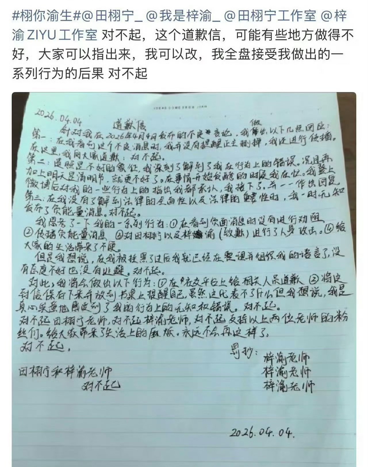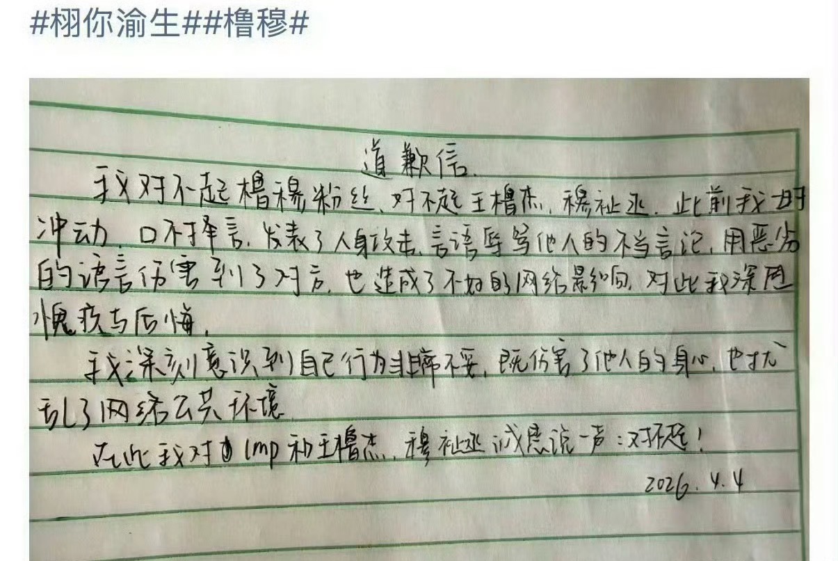 6.0cp粉前两天撩架后续来了栩你渝生粉丝给橹穆、橹穆批手写了道歉信 打也没打过,还滑跪了栩你渝生粉丝和橹穆粉丝的道歉信
