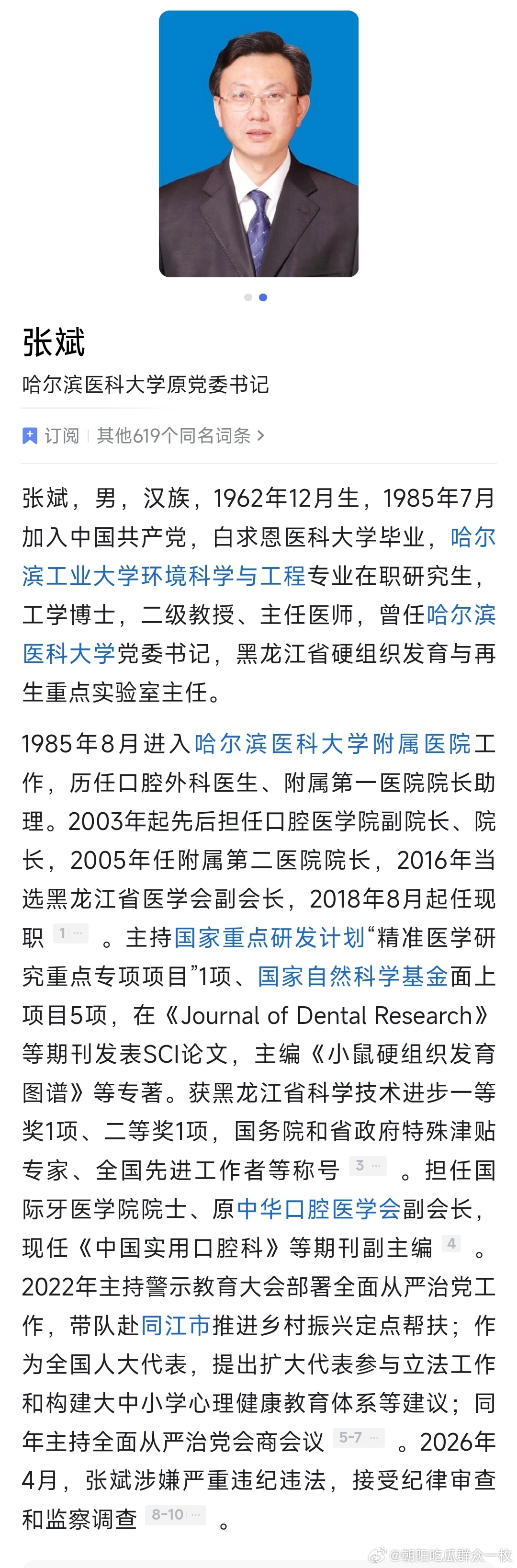 哈尔滨医科大学原党委书记张斌接受纪律审查和监察调查。