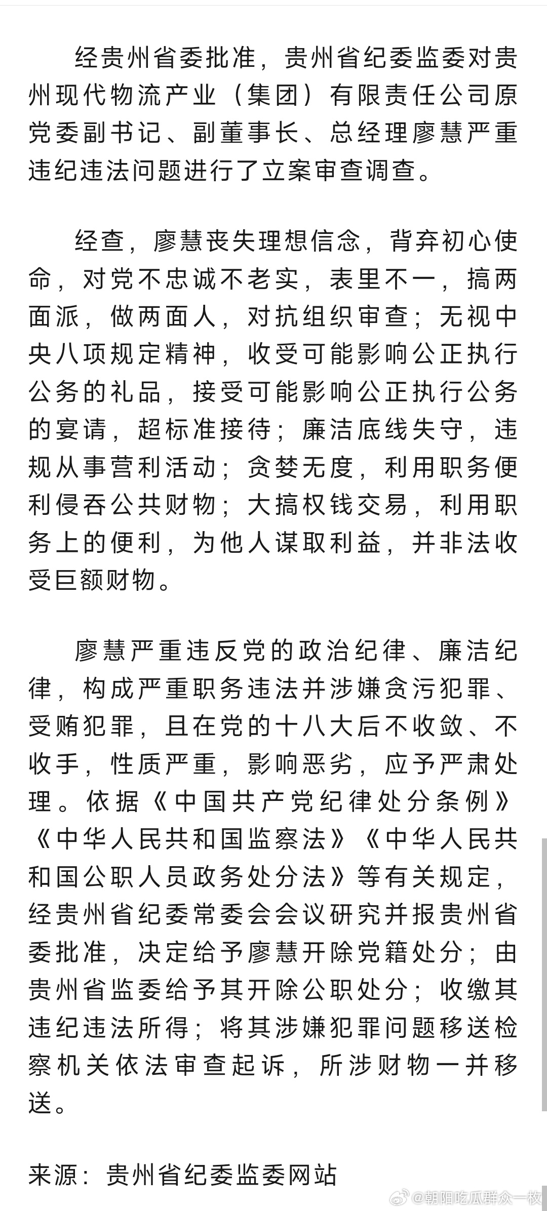 贵州现代物流产业(集团)有限责任公司原党委副书记、副董事长、总经理廖慧被开除党籍和公职