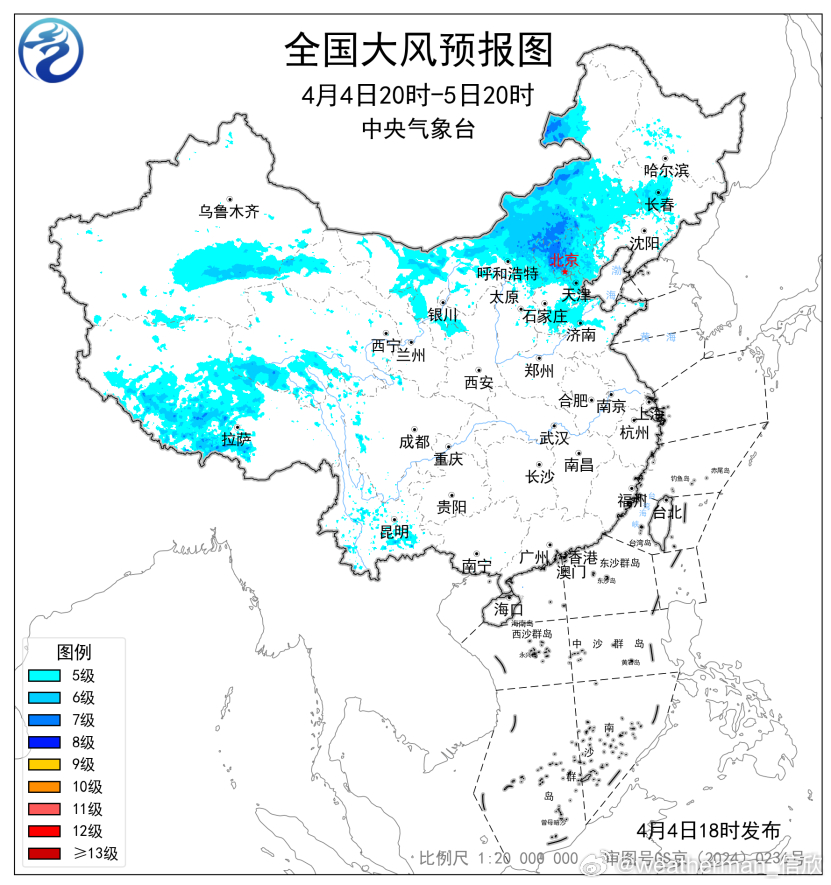 今晚中央气象台继续发布大风蓝色预警和沙尘暴蓝色预警,预计,4月4日20时至5日20时,内蒙古大部、山西北部、京津冀北部和南部、山东北部、新疆南部、青海南部、西藏中西部、川西高原北部等地部分地区有5~7级风,阵风7~9级;其中,内蒙古中部局地阵风10级以上。北方的大风,还是中午-下午最强。