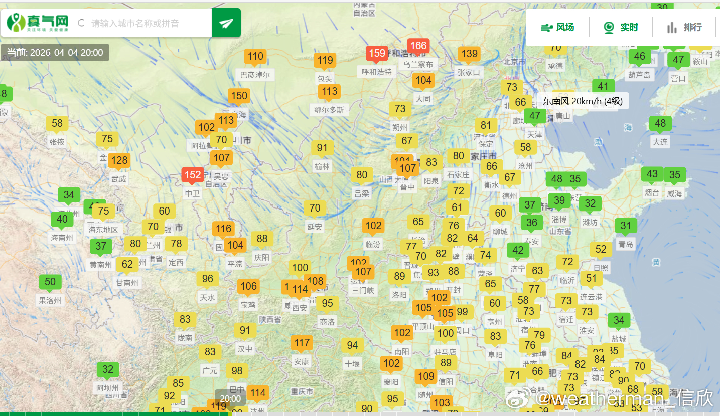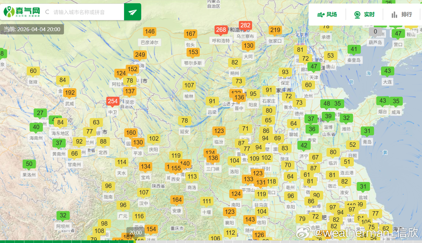 【风沙 大雾】从今晚20时空气质量看,甘肃宁夏陕西内蒙古山西河南部分城市,因为沙尘影响,还有些轻度污染,对应PM10超标(图2),PM2.5较低(图3),宁夏中卫、内蒙古呼和浩特和乌兰察布出现中度污染。今晚到明天还有补充冷空气南下,北方可能还会出现大风沙尘,但强度不会很强。