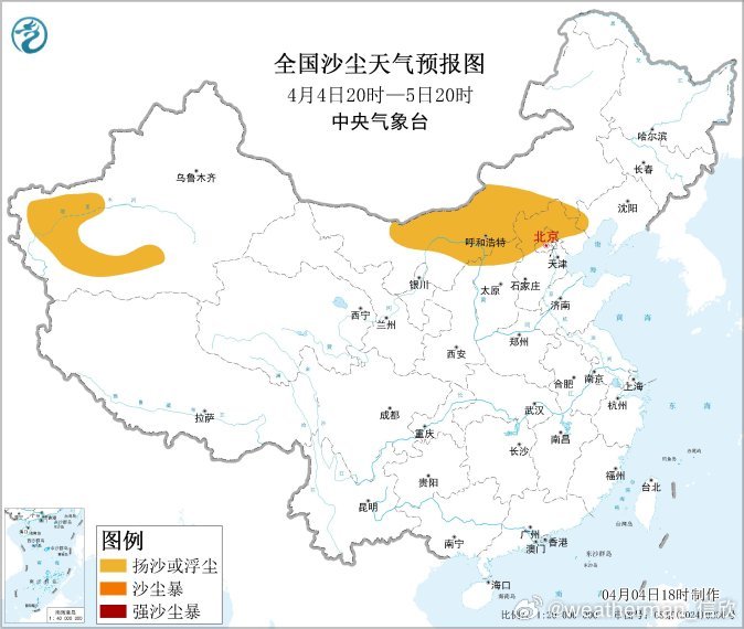 受冷空气大风影响,预计4月4日20时至5日20时,新疆南部、内蒙古中西部、山西北部、河北中北部、北京中北部等地的部分地区有扬沙或浮尘天气。