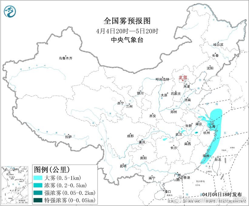另外,预计,4日20时至5日20时,黄海西南部海域、东海西部海域、长江口附近海域、杭州湾、浙江沿海、福建沿海将有能见度不足1公里的大雾;此外,4日夜间至5日上午,江苏南部、上海等地有大雾天气,局地有能见度不足500米的浓雾。
