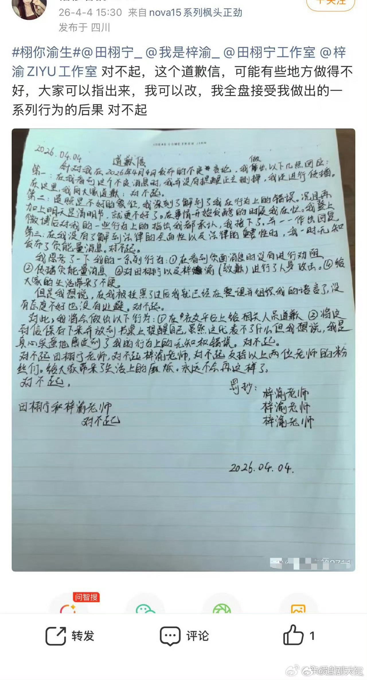 栩你渝生粉丝和橹穆粉丝的道歉信 栩你渝生粉丝和橹穆粉丝的道歉信,这算双方的和解信