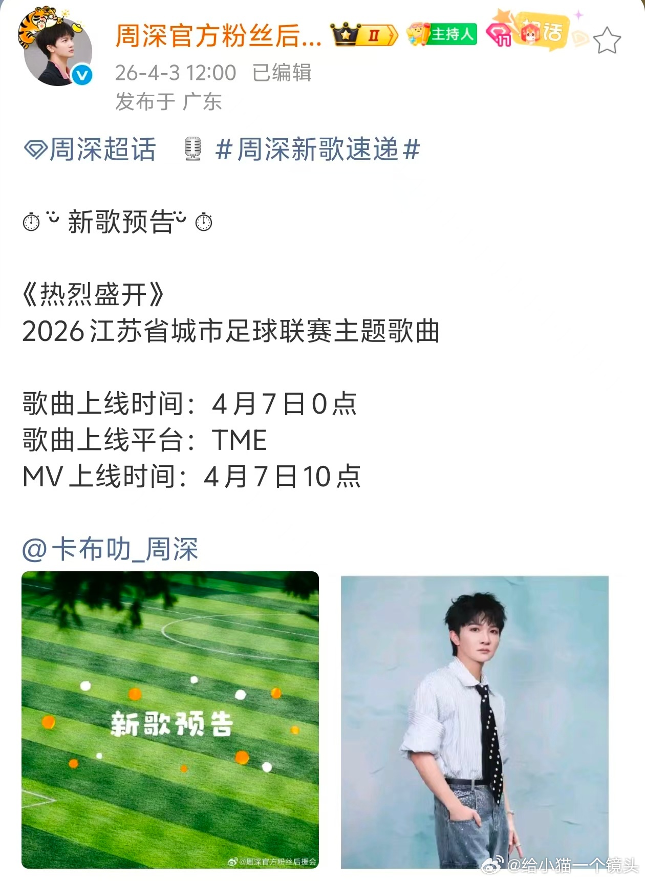 期待周深2026江苏省城市足球联赛主题歌曲《热烈盛开》