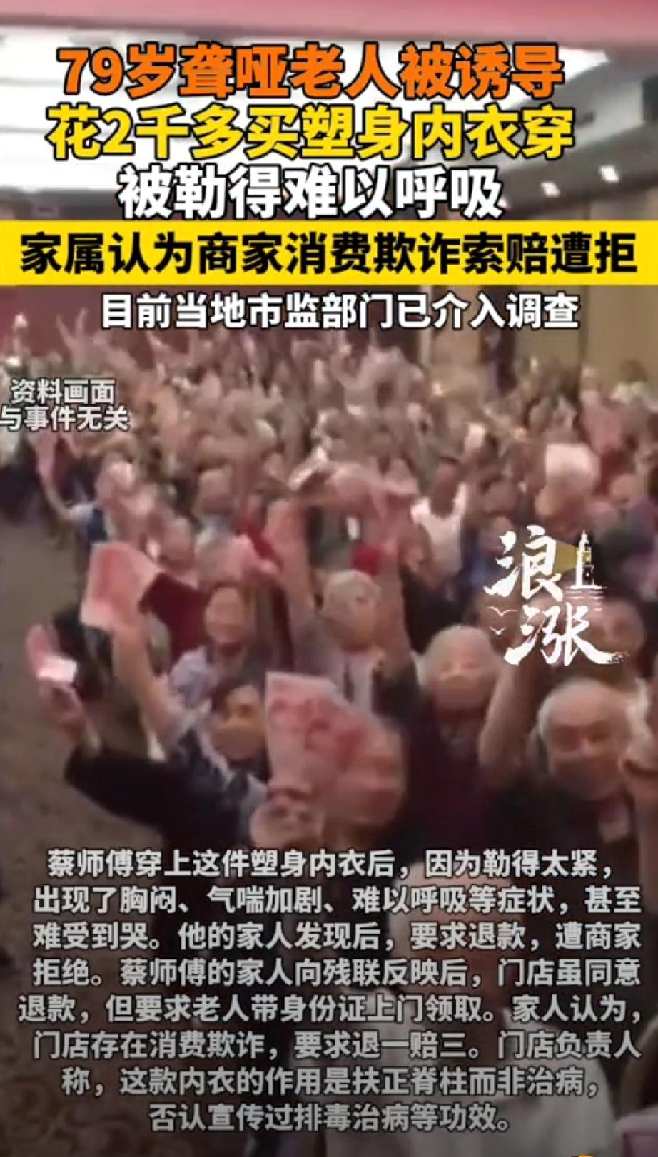 缺德冒烟!浙江绍兴,79岁的聋哑老人蔡师傅,被店家忽悠,花2380元买了件塑身内衣,说是能治病 ,没有想穿上后勒得喘不过气,本来就有心脏病和气喘,这下更严重,急得当场哭了 。家人发现后去找商家退货,商家还不认账。 蔡师傅今年79岁,是位聋哑老人,平时有气喘和心脏问题,一直靠吃药控制。 前段时间,他路过一家叫“品质生活体验中心”的门店,被拉进去做了一次免费“身体检测”。 检测结果说老人“健康指数54.50分,属于不健康”,还说什么“湿气重、血瘀、心肾不交”。老人一听就慌了。 这时候,店里一名同样是聋哑人的销售人员凑上来,给老人推销一款塑身内衣,说这个衣服能治病。 老人信以为真,先交了399元买了个什么理疗套餐,后来又专门取现金,总共花了2380元买了那件内衣。 商家接过钱,顺手就把内衣上的标签剪掉了——这是怕老人回家后家人发现不对,拿去退货。 老人满怀期待地穿上内衣,结果悲剧了。 这内衣勒得特别紧,他本来就气喘、心脏不好,这一勒,胸闷得更厉害,气都喘不上来,难受得眼泪直流。 一个79岁的聋哑老人,说不出话,只能默默掉眼泪,那画面谁看了不心疼? 家人发现后立刻找商家要求退款,商家一口拒绝。 家人又找到残联,残联介入后,商家才松口说可以退款,但条件是——老人必须自己拿着身份证,到店里来领钱。 79岁的聋哑老人,走路都费劲,这不是刁难是什么? 家人认为这是消费欺诈,要求退一赔三。可商家这时候改口了,说内衣的作用是“扶正脊柱”,从来没说过能治病。 目前市监部门已经介入,要求门店先退款,但家属还在考虑走法律程序。 一个快80岁的聋哑老人,省吃俭用攒点钱,想买个东西治治病,结果不但没治好,反而被勒得喘不上气,难受得哭。 你们想想,如果是你自己的爷爷被人这么骗,你什么感受? 正如网友说:“79岁的聋哑老人,连话都说不出来,你们骗他两千多块,良心被狗吃了吗?” 最可恨的是,商家还专门找个聋哑人来推销,这叫精准诈骗。利用残疾人之间的信任感,去骗另一个残疾人的养老钱,这是什么行为? 这叫吃人血馒头!这种黑心商家,就应该罚到倒闭!” 还有那个“拿身份证上门退款”,说白了就是故意恶心人。一个79岁的聋哑老人,出门都不方便,你们让他自己上门? 真要诚心退款,不会转账?不会送上门?这就是欺负老人好说话、家人不在身边。 我们每个人家里都有老人。今天他们能骗蔡师傅,明天就能骗你爸妈。对这种黑心商家,绝不能手软!