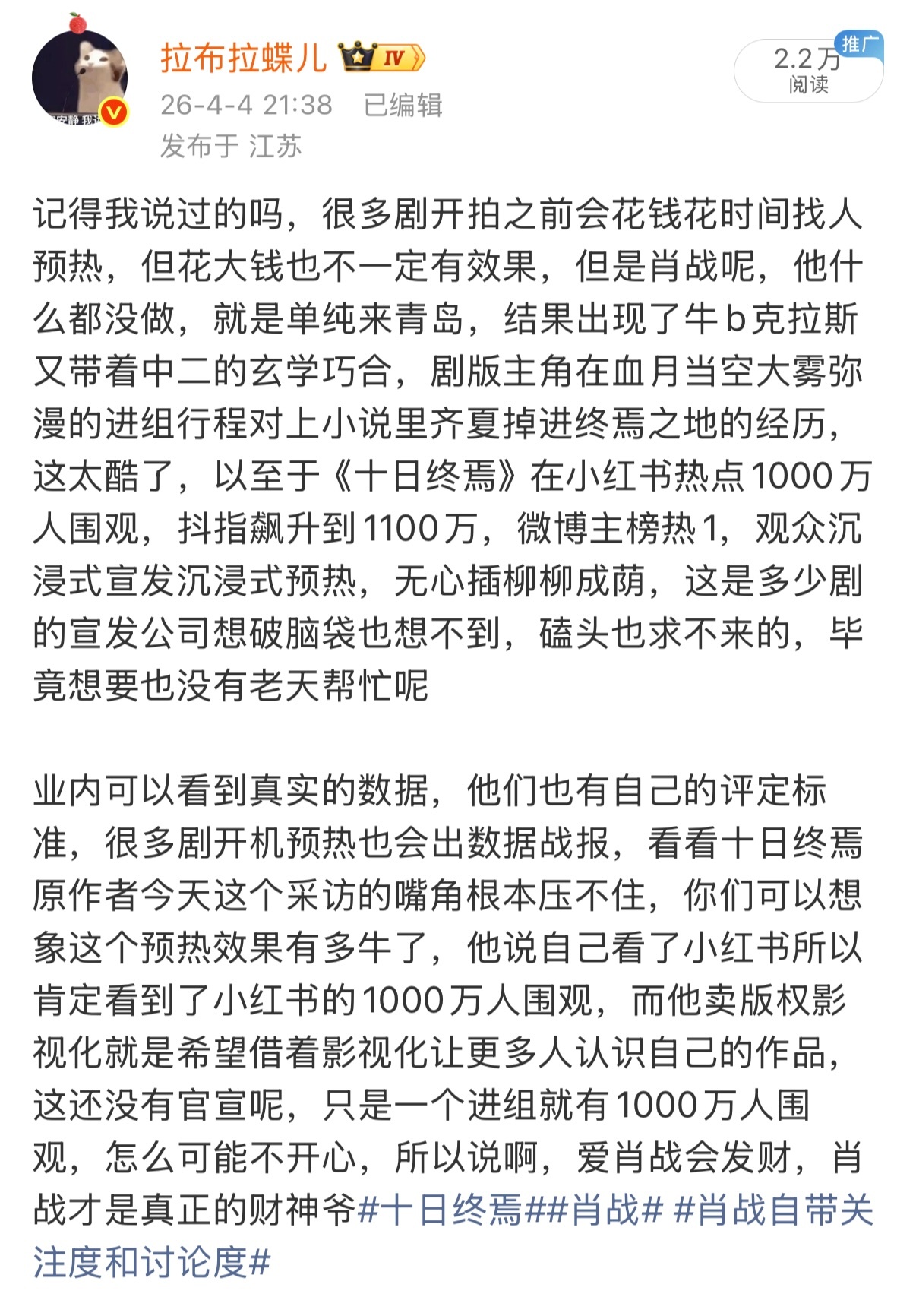 青岛为肖战粉丝准备休息区十日终焉作者谈青岛出现血月十日终焉原作者都知道青岛血月了,这次大出圈,除了肖战本身充满玄学气质,还有一个重要原因,肖战活粉真的太多了,活人多,巧思多,联想快,肖战粉丝里有相当一批《十日终焉》书粉,第一时间联想到这个巧合被营销号搬运,99%的营销号是没什么原创能力的,粉丝说什么他们搬什么,活人粉丝多,粉丝造梗,营销号搬运,路人看到营销号,路人加入讨论,产生良性循环不断扩大影响力,藏海传各种梗就是这么爆的,有肖战的剧,从头到尾都很热闹,和过年似的十日终焉