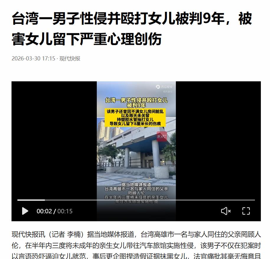 台湾高雄一名父亲,半年内三次将未成年的亲生女儿带进汽车旅馆实施性侵。除了性侵,还用塑胶水管抽打女儿,手臂上留下8厘米长的永久伤疤。女儿患上严重的创伤后应激障碍,只要碰到陌生男性就害怕,睡梦中都会惊醒大叫。法庭上这个畜牲毫无悔意,不仅否认罪行,还污蔑亲生女儿“性关系复杂”。他甚至辩称自己有“夜盲症”,晚上没法骑车去汽车旅馆。最终,他被判9年。 这段文字是从台湾媒体的判决报道里提炼出来的,但我宁愿这辈子都不需要看到这种内容。所以今天这篇微头条,我打算换一种写法,不加渲染,不加修辞,就用最干枯的、最冷冰的判决书语言,给你还原一下,这个案子到底有多烂。 那个从13岁就开始被侵犯的女孩,她现在怎么样了?答案在判决书里写着:“出现逃避、过度警醒及失眠等严重的创伤后压力症候群症状,只要接触到陌生男性便会感到害怕,甚至在睡梦中会惊醒大叫,强烈表达‘不希望再与父亲一家有任何瓜葛,并希望父亲能受到司法制裁’”。 我们把时间拨回2023年。根据高雄地方法院判决书记载,这名父亲与前妻离异后另娶,与女儿、现任妻子及母亲同住于高雄市。 2023年11月到2024年5月的半年里,他三次骑机车把女儿载往高雄某汽车旅馆。他利用体型优势及言语恫吓,强迫女儿褪去衣物共浴,强行发生性关系。 甚至还有一次携带假阳具按摩棒,在性侵过程中一并插入,事后竟还让女儿带回家“收藏”。这是人干的事吗? 法院认定该男子犯下成年人故意对少年强制性交罪3罪、伤害罪1罪,合并执行有期徒刑9年。9年,对于女儿一生无法愈合的创伤,对于这个家庭被撕裂的一切,这个数字,到底意味着什么,大家心里都有一杆秤。 现在说说这个人在法庭上干了什么。他矢口否认所犯罪行,辩称不知汽车旅馆在哪里、机车钥匙在现任妻子身上,甚至瞎扯自己有“夜盲症”晚上无法骑车。 更令人震惊的是,他还污蔑女儿,企图将女儿塑造成性关系复杂的形象。路口监视器与车牌辨识系统清楚记录下他骑车载女儿前往汽车旅馆的行踪,旅馆也有对应的开房与现金付款记录。 按摩棒顶端也验出了女儿的DNA。所以,证据链确凿,他的所有辩解,只是让法官在判决书里多写了几条驳斥理由。 法官在判决书里,对这个父亲的行为,做了法律上的认定。法官痛斥加害人身为生父,为逞一己私欲,严重戕害女儿身心发展,且犯后不仅矢口否认,还设词诬蔑女儿,企图混淆视听,犯后态度极为恶劣。判决已尘埃落定。但故事,远没有结束。 你可能会问,9年是不是太轻了?根据台湾地区的《刑法》,强制性交罪基本刑期为3年以上10年以下,对未满14岁之男女加重处罚。 法官认定他犯下4罪,合并执行9年,已是在法律框架内从重判决。但一个父亲对亲生女儿做出这种事,再重的刑期,也无法换回那个孩子无忧无虑的青春。 所以,写下这篇东西,不是为了给你添堵,只是想让你知道,在我们的视线之外,有些事情,烂得超乎想象。 而那个在汽车旅馆里被亲爹用假阳具侵犯的女孩,她才15岁。她这一生,该怎么学会去信任一个男人?这才是最让人无力的地方。 消息来源: 台湾一男子性侵并殴打女儿被判9年,被害女儿留下严重心理创伤 2026-03-30 17:15·现代快报