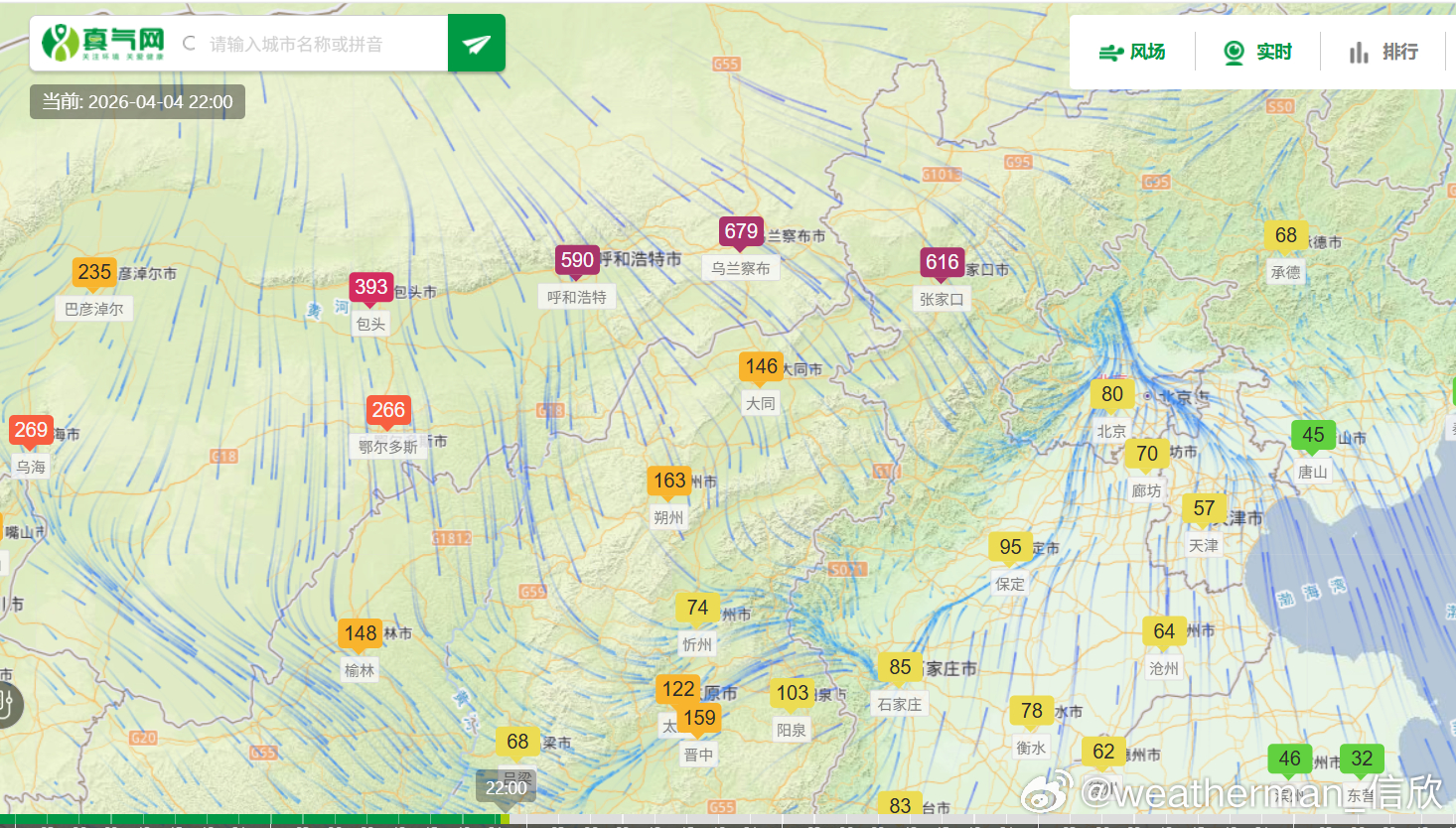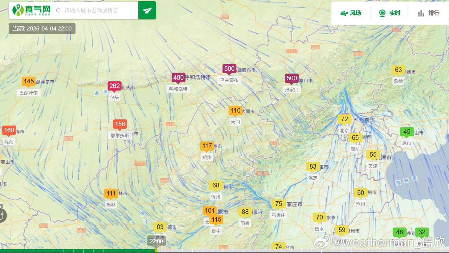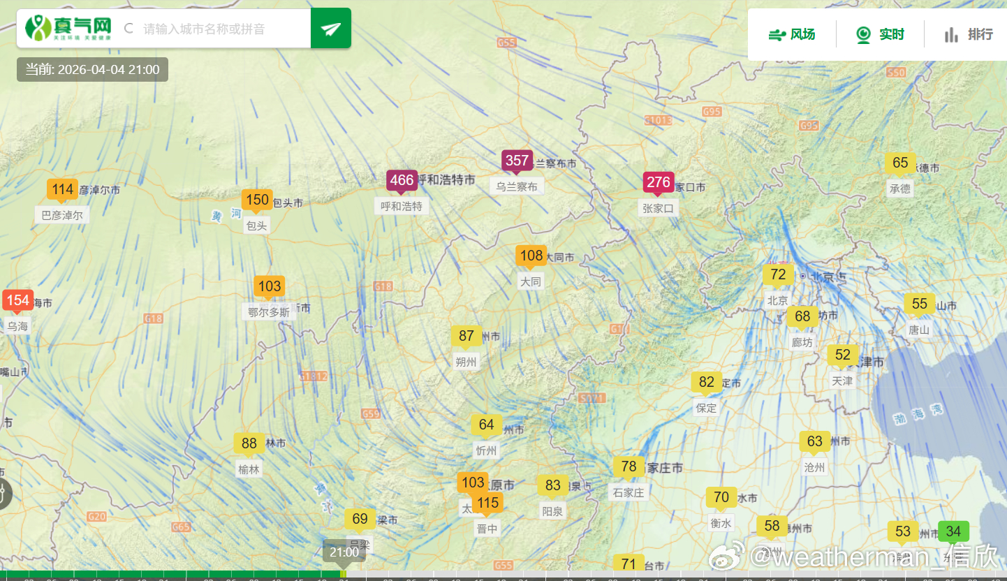 【沙尘】今晚有沙尘东移南下,内蒙古呼和浩特-乌兰察布-河北张家口,空气质量明显转差。22时乌兰察布、张家口出现爆表,PM10浓度超600微克/立方米(图3)。这波沙尘未来继续东移南下,明天凌晨可能过境北京。