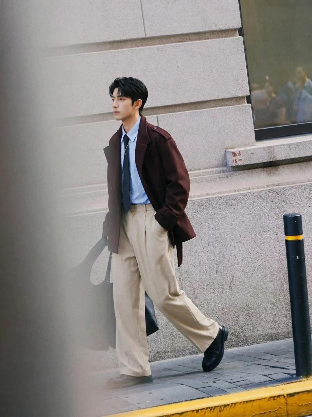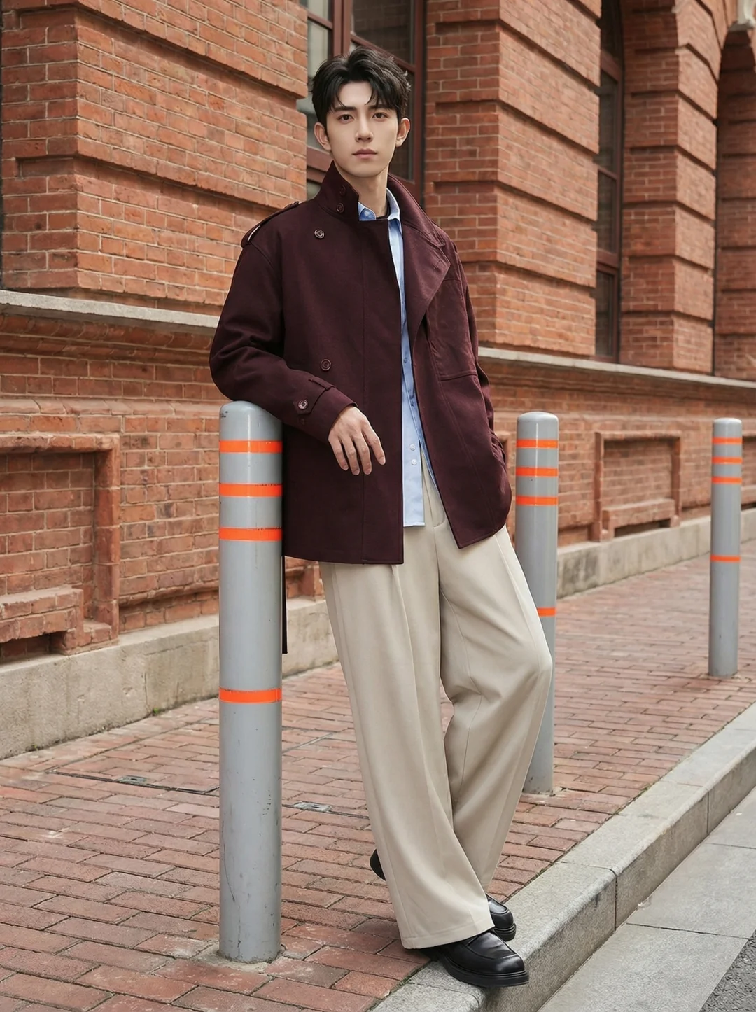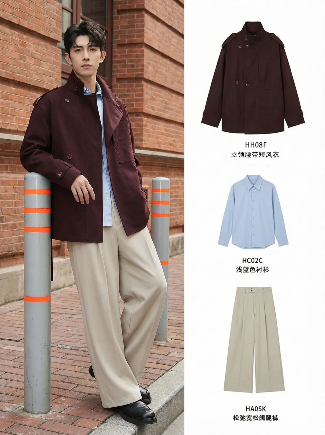 这套紫檀短款风衣彻底打破了长款带来的压抑感。对于身型偏小或追求利落比例的男生来说,衣长落点就是生命线