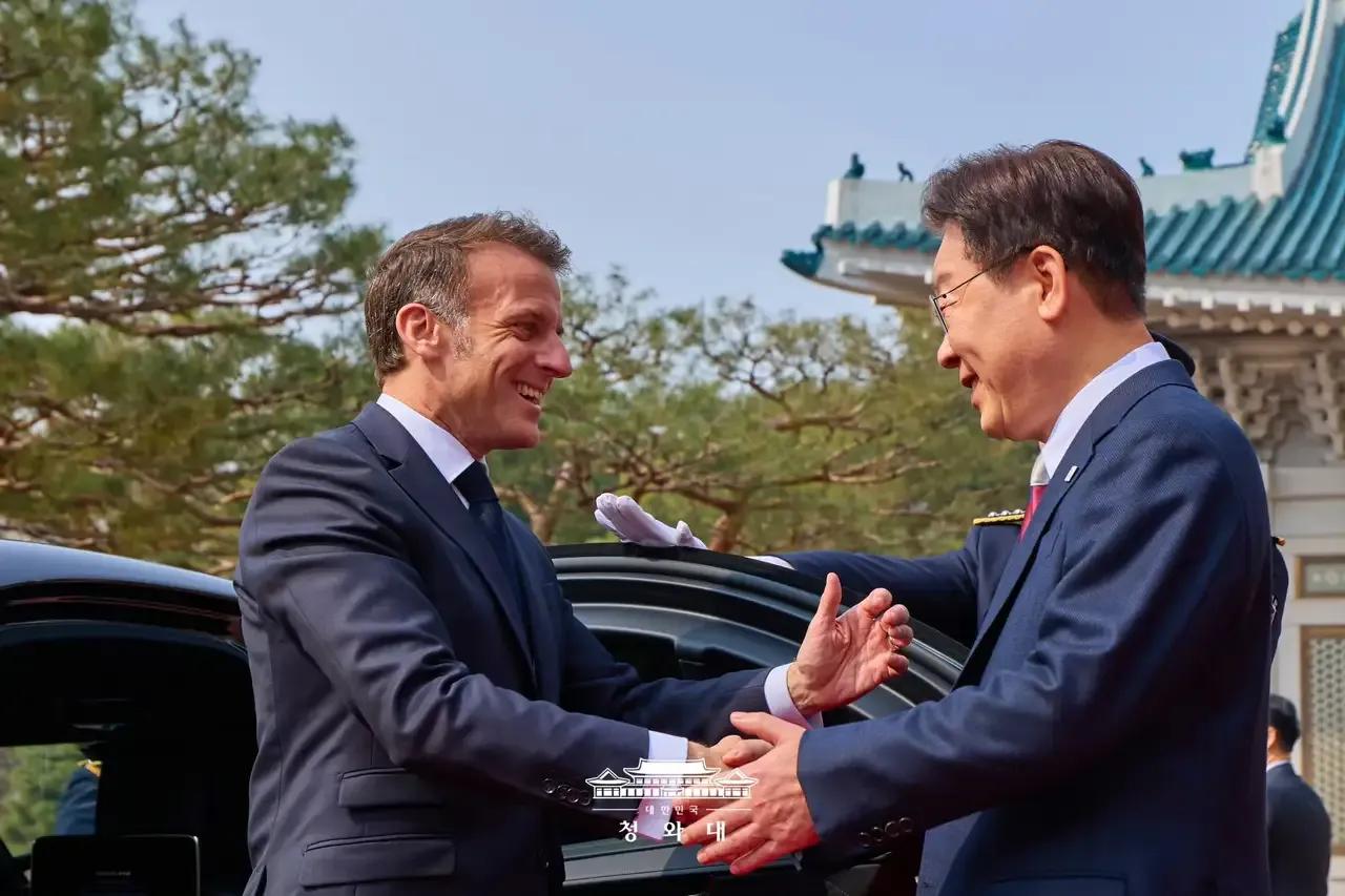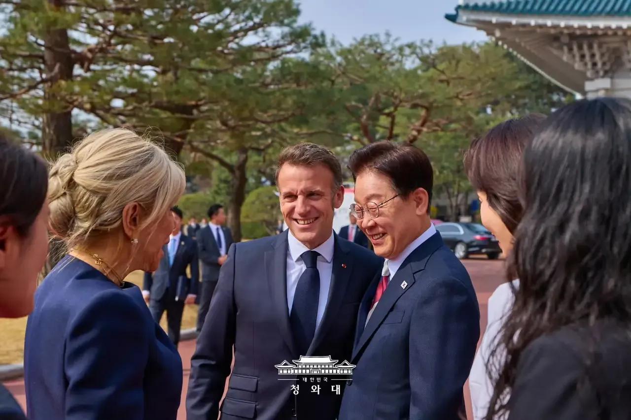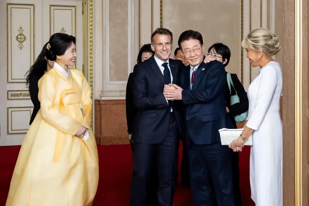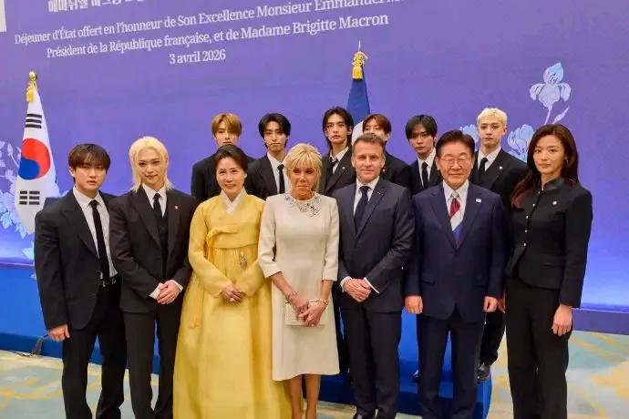 法国总统马克龙访问韩国,李在明给足了面子,每一站行程排面氛围拉满。 李在明夫妇高规格接待马克龙,凸显出两国关系不一般。两人关系非常友好,感觉兄弟一般亲。 在马克龙午餐宴上,李在镕,李富真兄妹罕见同框出席。还有韩流人气男团,全智贤盛装出席,亲切交流合影。 马克龙真是不虚此行,多亏了李在明的用心安排。今日话题