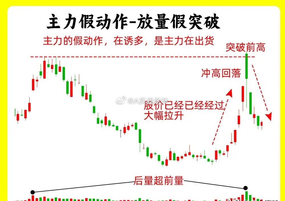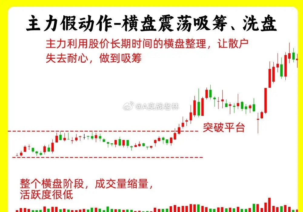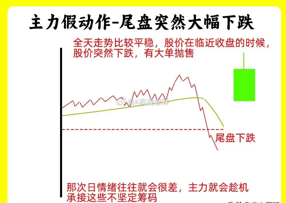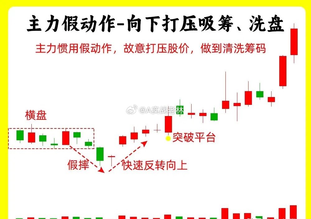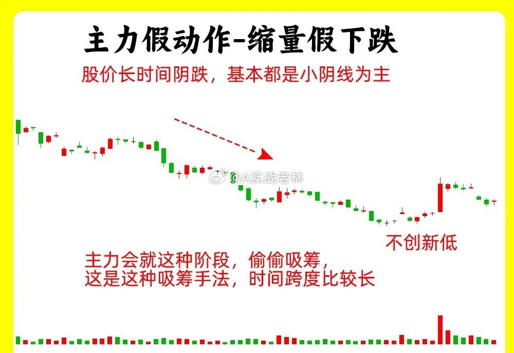 注意了!这五种形态都是主力故意做出来的假动作,交易其实就是一种心理和博弈的过程。了解主力的假动作,就能大大提高自己的认知。还说是老规矩,点赞收藏或评论888支持一下,老林每天分享炒股干货,以免以后想温习找不到了。假动作一、横盘震荡吸筹和洗盘股价在低位横盘震荡,处于一个上下振幅,形成一个箱体,随着时间的推移,上方就是箱体上沿,下方就是箱体下沿,基本都是小阴线小阳线。一般这样的走势出现,不管大盘的走势如何,他基本能走出自己的走势,这就是主力偷偷吸筹、洗盘的结果假动作二、向下打压吸筹 / 洗盘股价在低位形成一个平台,股价在横向移动,突然股价跌破了这个平台,可能出现连续几天的阴线,这样的走势很突兀,但是股价下跌的过程里,成交量并没有出现放量,股价跌破平台以后,又快速的重新回到平台内,就形成一个V形的反转的走势,这是主力故意打压股价,形成假摔假动作三、放量假突破股价经过长时间的上涨以后,形成一个高点,随后股价开始回调,然后再次上涨,突破前期高点,随后继续下跌,看着放量突破,其实并没有站稳,这个有一个细节,在两个高点位置,他们成交量出现异动,第二次的高点的成交量出现天量,说明此时有大量的筹码在换手,我们把趋势线连接起来,就形成一个M头的顶部形态假动作四、缩量假下跌股价每天都在下跌,但是每天的成交量在逐步的缩量,而且K线往往都带着比较长的下影线,其实这是股价已经跌不动的表现,这其实就是主力控盘,并没有出货。这是缩量的下跌一般是会在上涨趋势的回档过程里。假动作五、尾盘突然大幅下跌在分时图里,股价全天走势平平,到了尾盘突然放量下跌,出现跳水,直接跌破均价线。就走出尾盘偷袭的走势。其实这是主力打压股价,偷偷吸筹好了!以上就是我们常见的五种主力假动作,下方我准备了对应的案例图,希望对大家有启发