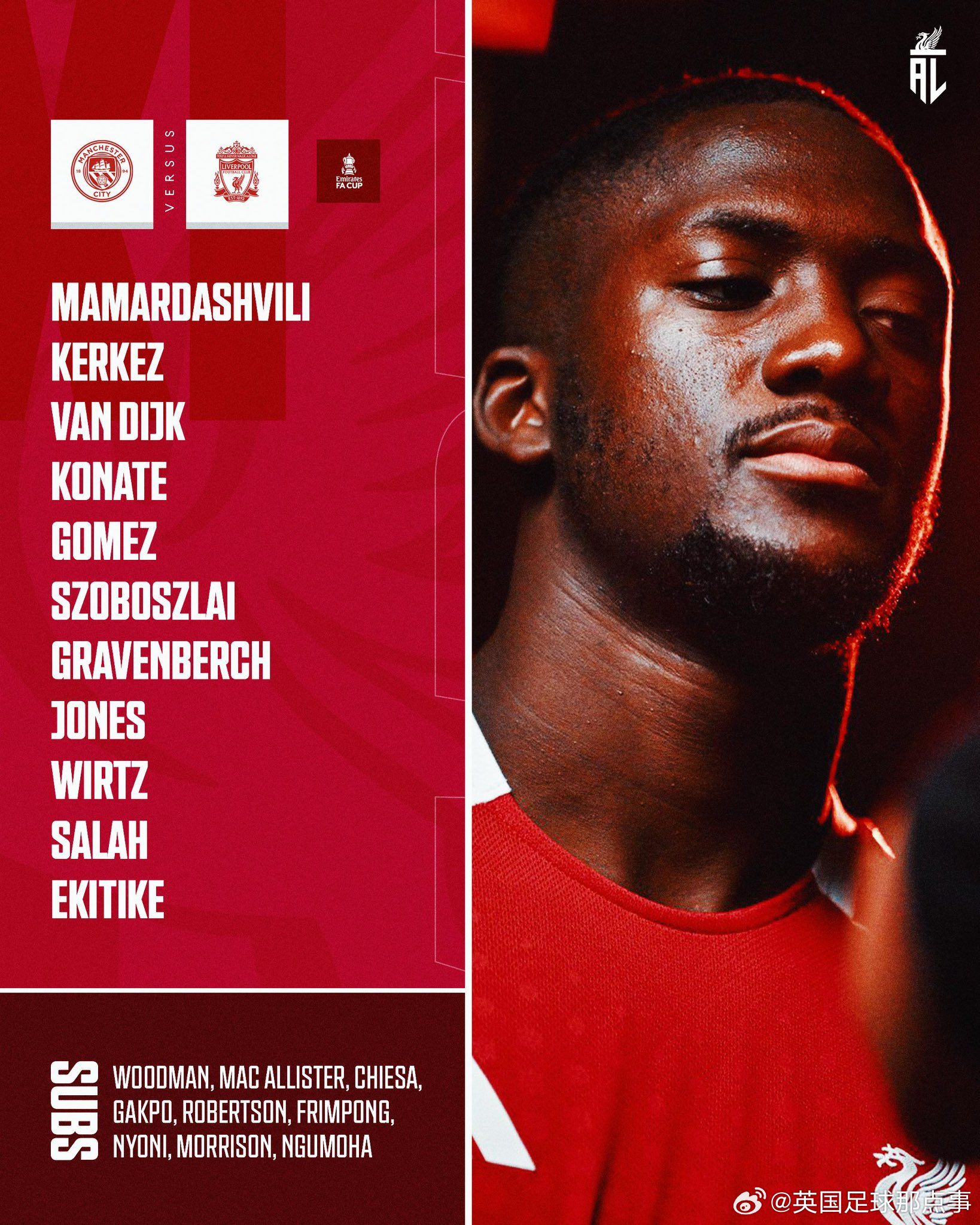 利物浦替补:28-伍德曼、10-麦卡利斯特、14- 基耶萨、18-加克波、26-罗伯逊、30-弗林蓬、42-尼奥尼、68-莫里森、73-恩古莫哈