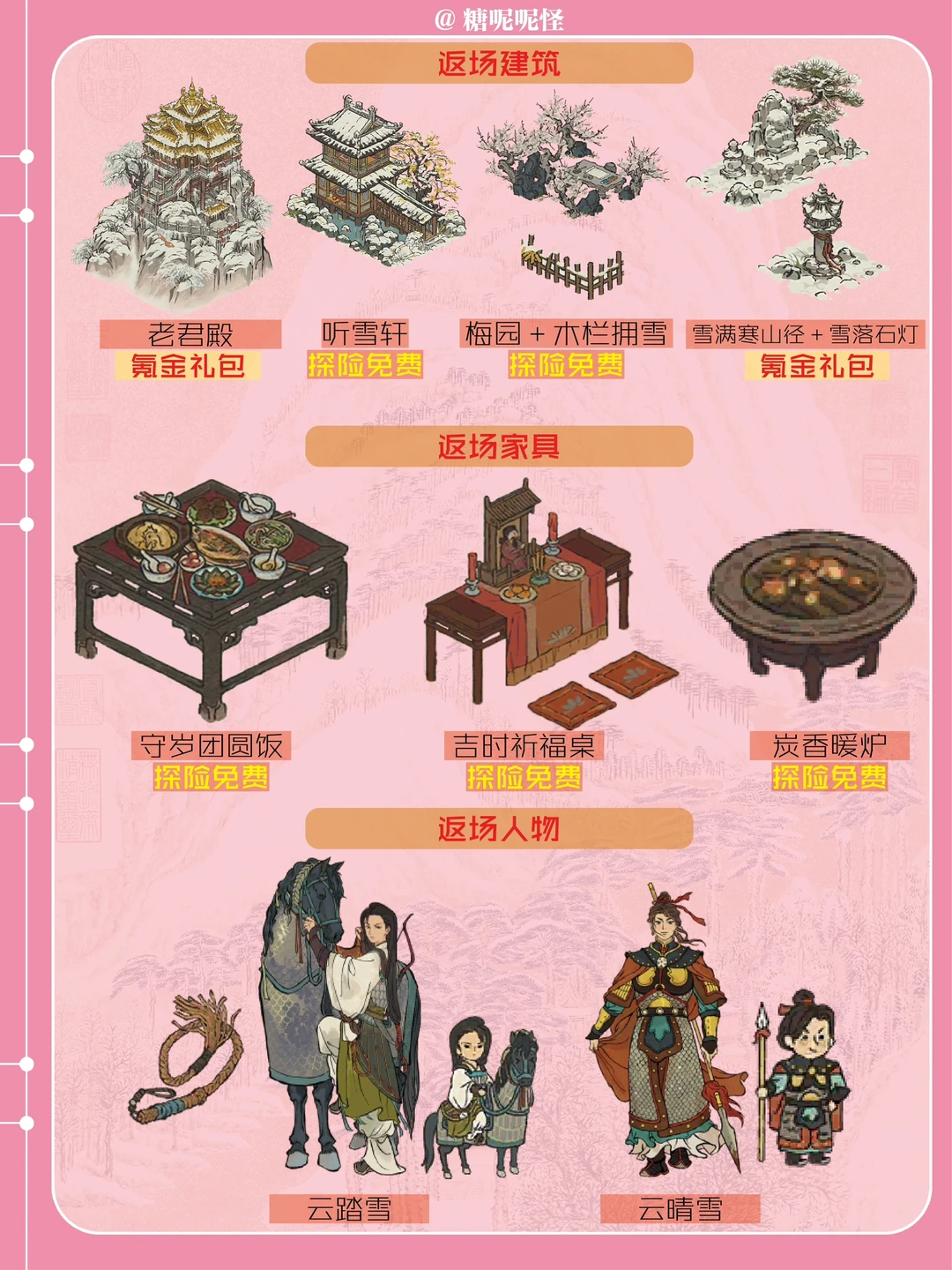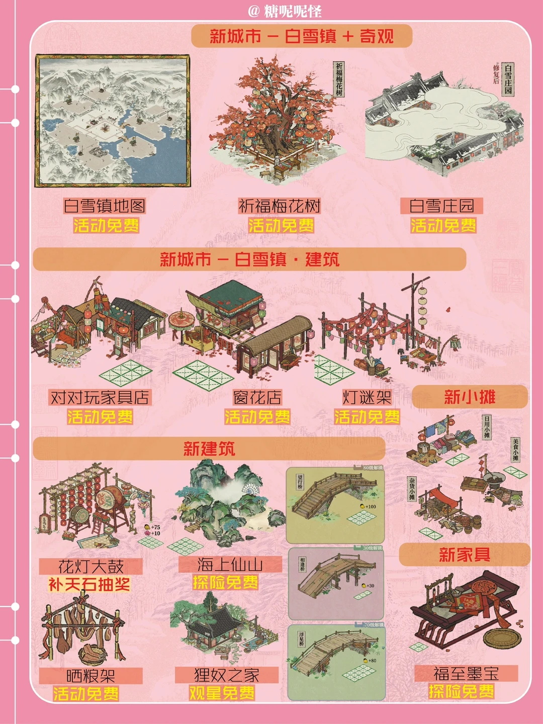 [一R]白雪镇即将上线 [二R]【祈福梅花树】+【白雪庄园】都是奇观 [三R]白雪镇新建筑:【对对玩家具店】【花窗店】【灯谜架】 [四R]白雪镇小摊:【日用小摊】【美食小摊】【杂货小摊】 [五R]补天石抽奖建筑:【花灯大鼓】 [六R]绍兴府探险建筑:【海上仙山】 [七R]鸡鸣山观星建筑:【狸奴之家】 [八R]新家具:【福至墨宝】 [九R]其他新建筑:【晒粮架】