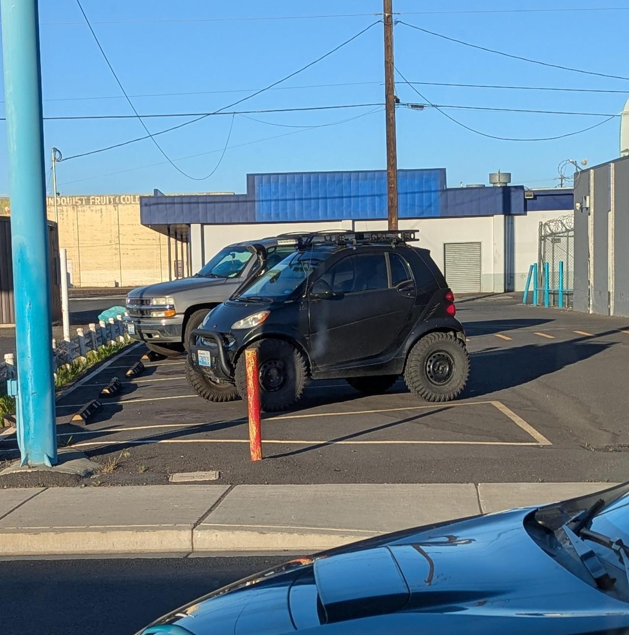 这辆越野版Smart汽车经过大幅改装:车身升高,配备越野轮胎,悬挂行程可观,接近角和离去角夸张。有网友调侃可能需要马戏团级别的外部防滚架来防翻车。由于Smart本身重量轻,改装后接近沙滩车,越野时可能很有趣。不过这种改装市场规模小,轮胎转向时容易与车身摩擦。