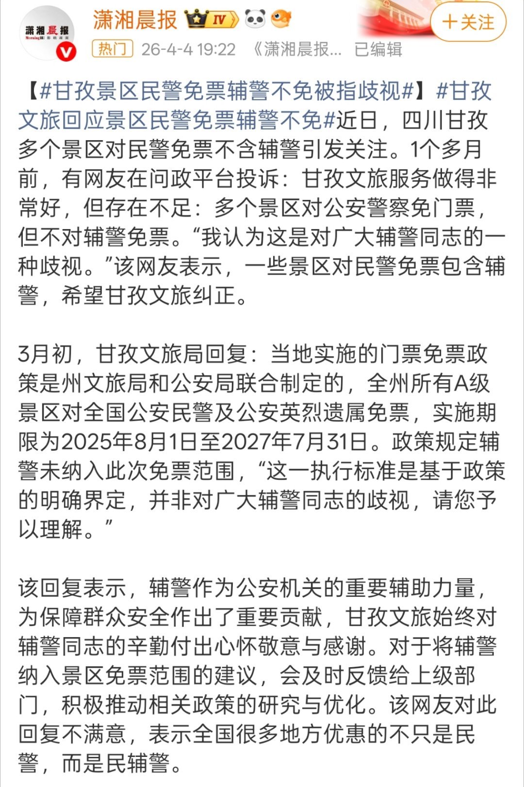 甘孜景区民警免票辅警不免被指歧视其实很多辅警工作也挺辛苦的,这种景区免票还是一视