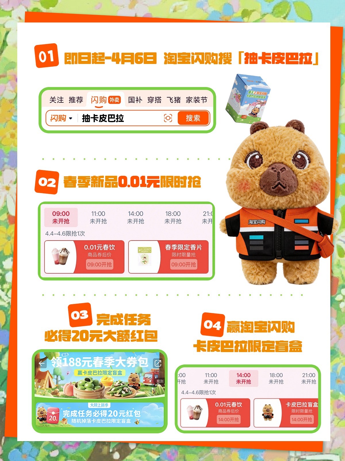 1️⃣ 春季新品0.01元限时抢2️⃣ 完成任务必得20元大额红包3️⃣ 还能赢卡皮巴拉限定盲盒🎁