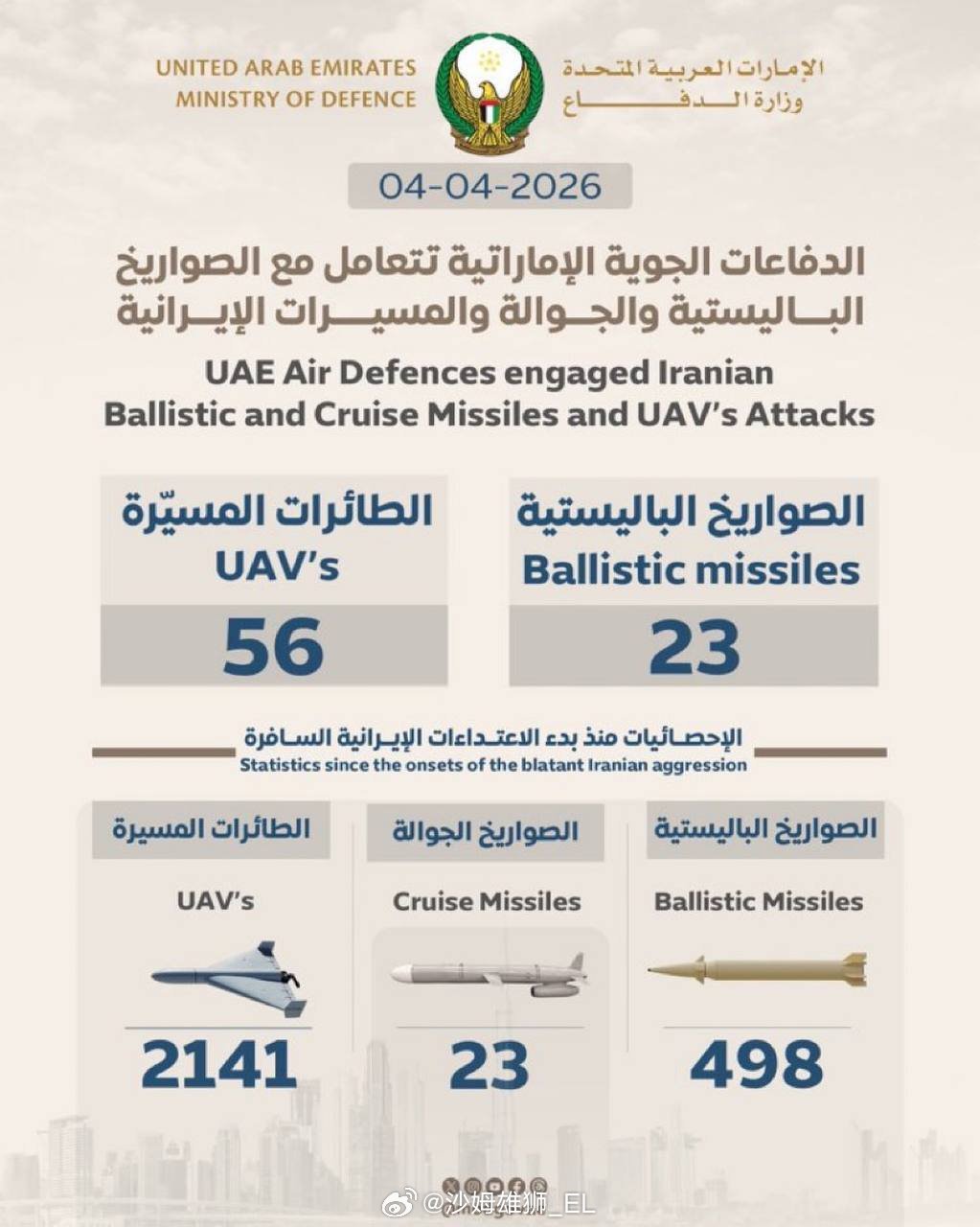 阿联酋国防部宣布在过去一天内拦截伊朗发射的23枚弹道导弹和56架自杀式无人机,宣布的拦截总数为498枚弹道导弹、23枚巡航导弹和2141架自杀式无人机。