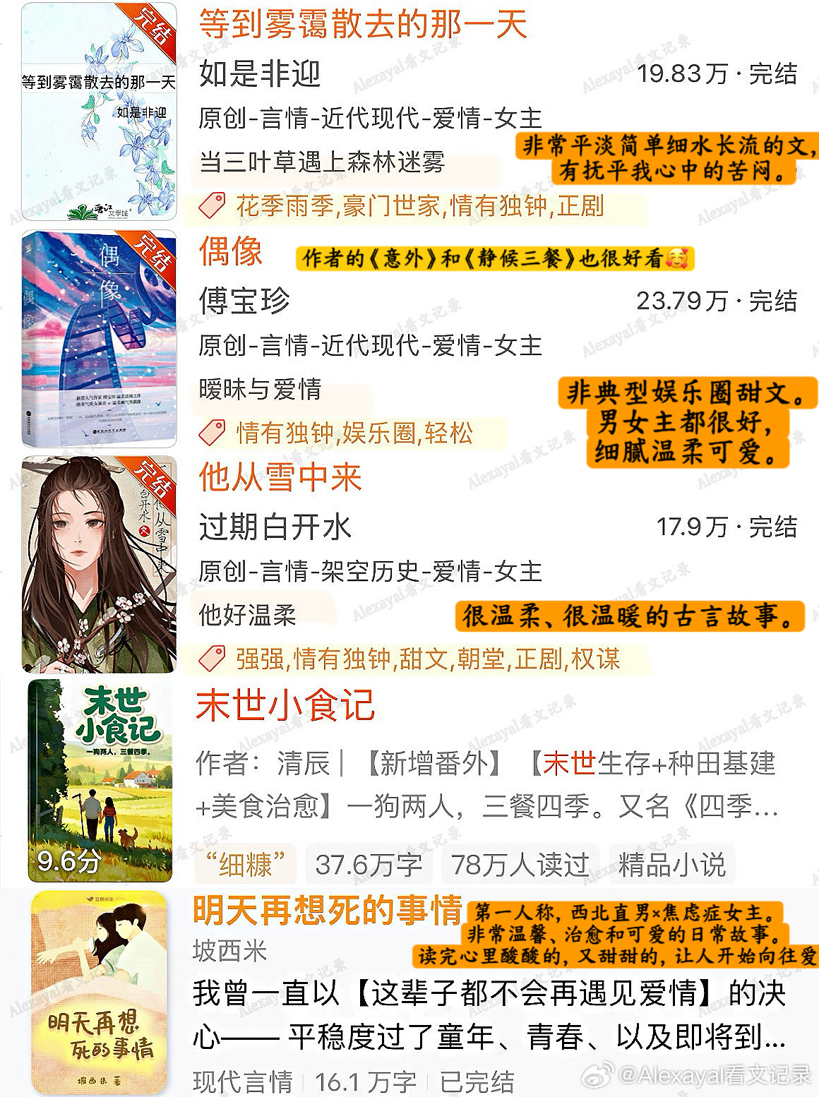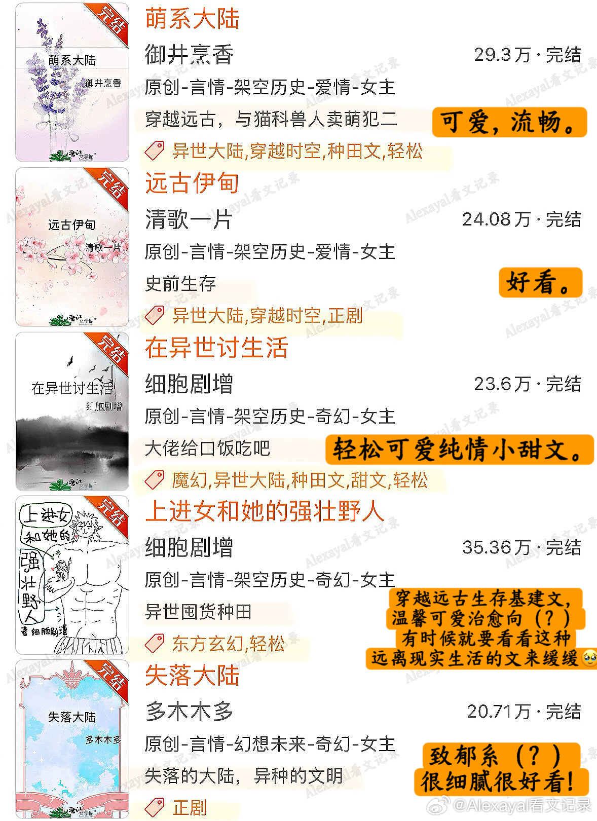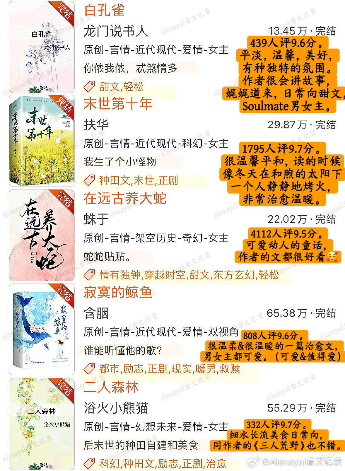 15年书龄读者吃过的一些读完内心能平静的top治愈向小说细糠盘点书单,适合睡前在被窝里阅读的一些温馨小甜文和远古/异世/末日/种田/美食文,大部分都是我二刷三刷过的经典佳作。♦️ 每当感觉人生没有意义/很疲惫/压力大/烦躁的时候,就爱看这些小说,看完heart软软。🥹 看这些文就像秋天看到金灿灿的树叶飘落;冬天在初雪中围炉烤火夜话,木柴在旁静静燃烧着,不时传来几声毕剥;春天傍晚被凉风拂面,在将暮未暮黄昏时听着歌走在路上;夏天沿途充满生命力压满枝头的花,偶尔突降大雨,趴在窗边栏杆听雨,会有一种生活还是很温柔的感觉。1️⃣ 《末.世第十年》《奇怪的先生们》扶华2️⃣ 《二人森林》浴火小熊猫3️⃣ 《白孔雀》龙门说书人|现言4️⃣ 《在远古养大.蛇》《变成丧s后被前男友抓住了》蛛于5️⃣ 《末世小食记》清辰6️⃣ 《寂寞的鲸鱼》含胭|现言7️⃣ 《等到雾霭散去的那一天》如是非迎|现言8️⃣ 《偶像》《意外》《静候三餐》傅宝珍|现言9️⃣ 《他从雪中来》过期白开水|古言🔟 《明天再想s的事情》坡西米|现言1️⃣1️⃣ 《妖王的报恩》《窗外的蜥蜴先生》龚心文1️⃣2️⃣ 《新婚日记》居尼尔斯♦️ 还有5篇异.世/远古文/种田文,也是我想远离现实世界时经常会重温的,都很好看!🥰:1️⃣ 《失落大陆》多木木多2️⃣ 《上进女和她的强壮野.人》细胞剧增3️⃣ 《在异.世讨生活》细胞剧增4️⃣ 《远古伊甸》清歌一片5️⃣ 《萌系大陆》御井烹香