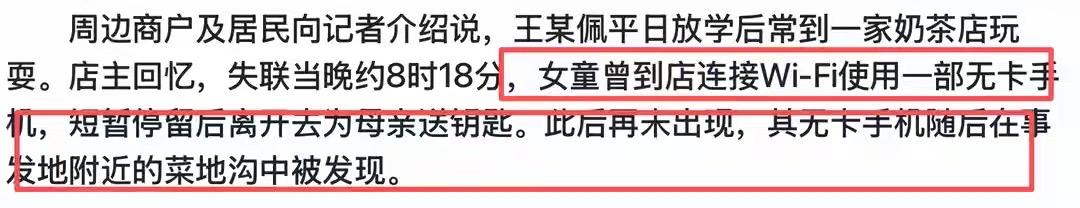 这位6岁失踪的女童已经错过了黄金的搜救期。他是给自己妈妈送钥匙,然后回家的时候经过了一段小路,这个小路刚好是没有监控,而女孩刚好就在这个监控中失踪的,而女孩随身携带的手机却被人发现丢在了菜地的地沟里。所以这就说明女孩被人带走的可能性非常的大,毕竟她不会将自己的手机给丢掉。 到现在为止,女孩失踪已经接近5天了。这个时候已经过了搜救的黄金时期,父母的猜测恐怕也会成真,所以也只能希望警方能带来好的消息了。 当然,从这件事情也看得出来,如今城市里还存在很多监控盲区,这一点警方应该注意一下,一定要做到城市里监控完全覆盖才行。