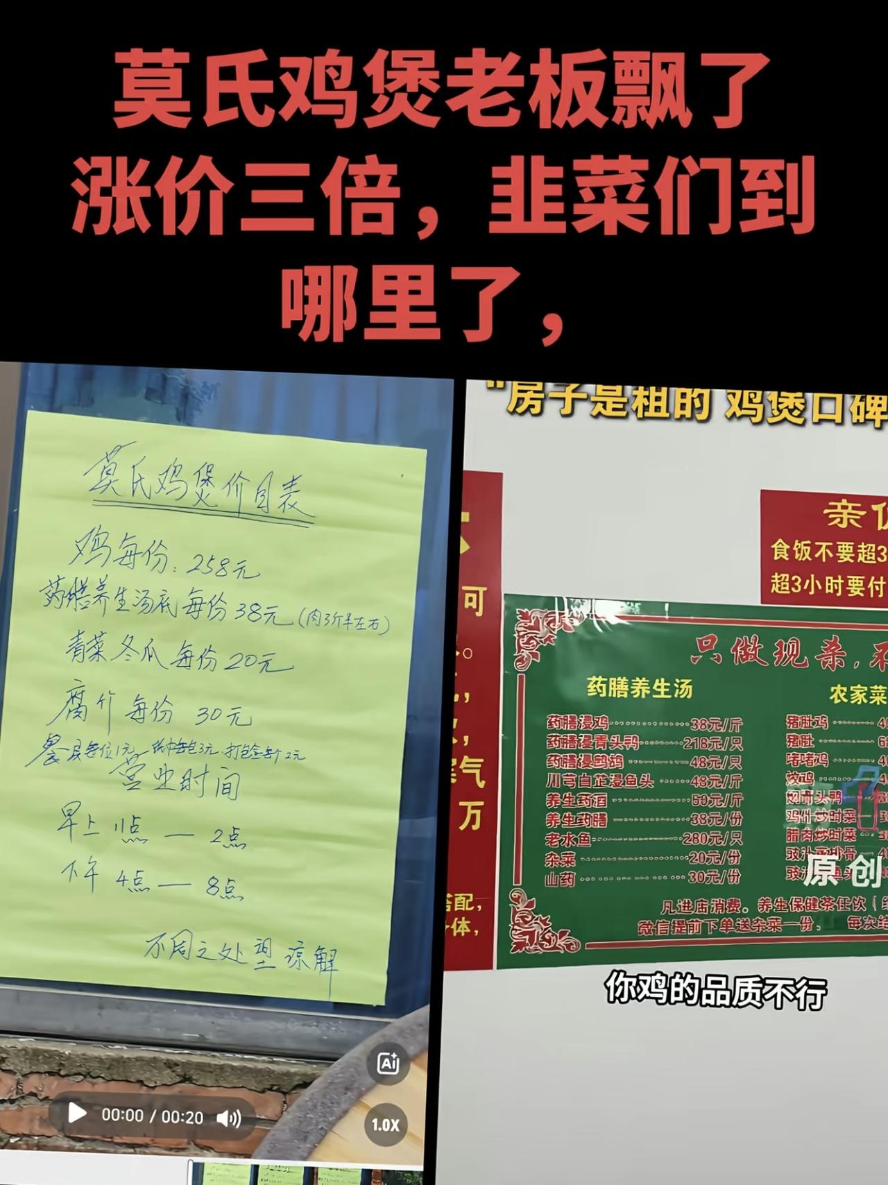 探店爆火的莫氏鸡煲,被网友曝光突然涨价了。我们从之前博主探店视频可以看到,当时店里给他选了一只5斤八的鸡,到后面还有配菜什么的,总共才花了262元。但现在网友们直接去的话,一份鸡肉就要258元,还不包含汤底,汤底的话要38元,青菜什么的要20元一份,腐竹要30元一份。 所以这样一搞的话,网友们点一份鸡,加点配菜就要300多块了,当然还有网友说这鸡肉吃起来有点柴,味道没有那么好。毕竟这是药膳鸡煲,这种味道本身就偏清淡。只适合那些口味清淡一点的人。 不过涨价能够理解,毕竟谁开店生意不想多赚点钱,我是老板也想趁着这波流量多赚点钱,哪怕以后没有生意,这波赚的钱也够了。
