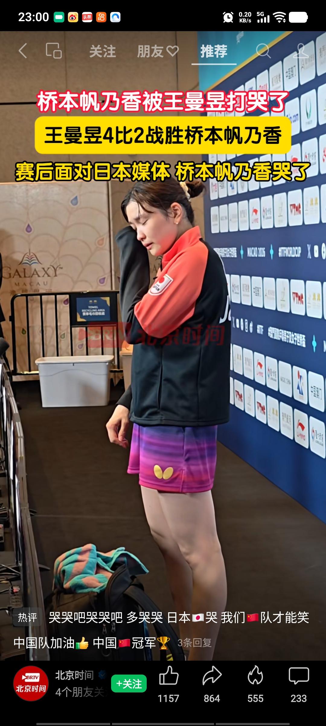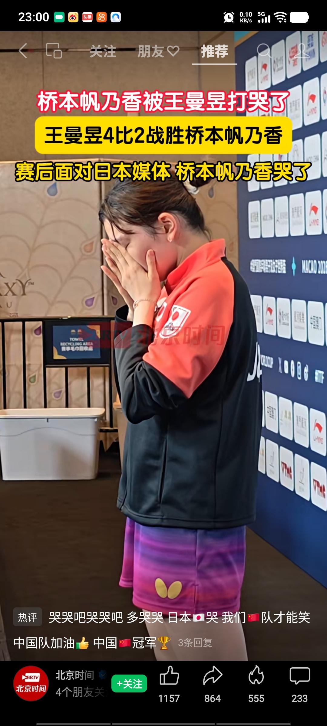 桥本帆乃香赛后接受日本媒体采访时哭了,哭的很伤心,今天她打的很不错了,这状态打其他选手,应该能赢下来,但她遇到的是王曼昱,尽管桥本竭尽全力,削中带攻很奏效,在王曼昱面前,还是觉得非常吃力,因为王曼昱有一颗大心脏,她稳扎稳打并不着急,由于比赛时间拉长,根据规则,第五局打到了数板,逼着桥本在13板内进攻,否则判丢一分,桥本着急了,王曼昱来了机会,经过不懈努力,王曼昱克服困难,艰难地以四比二取胜,太不容易了,桥本是近二十年以来,最好的削球手,也就是王曼昱能够战胜她。
