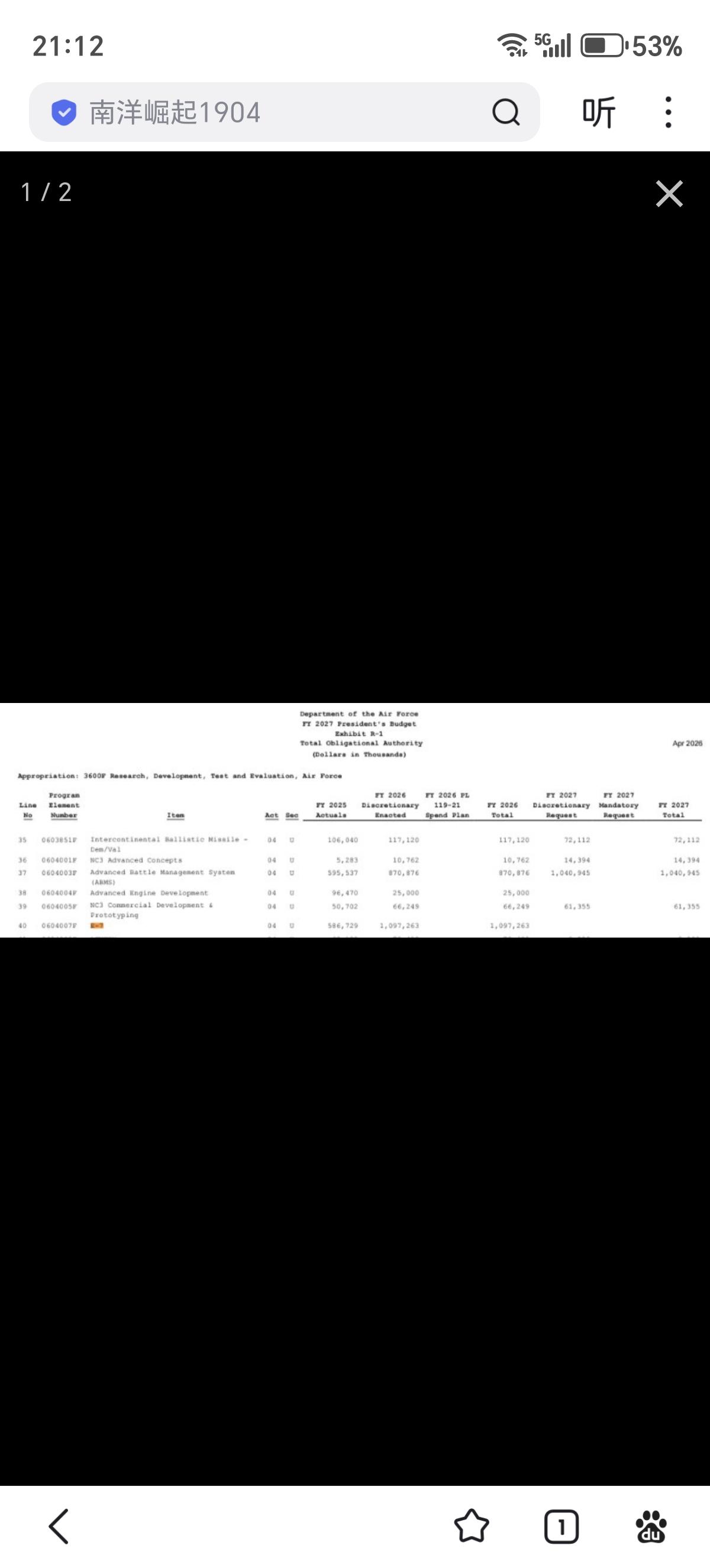 特朗普政府五角大楼在2027财年的预算中又把E-7预警机的资金归零了,美国国会估计又得费工夫把钱加回去。 特朗普政府不要E-7预警机,而是把钱都想投在太空AMTI雷达卫星上面,用这个替代预警机(当然这些钱可以更好的拿回扣,投给太空和卫星的话)。 预警机探测系统这一块,我可以很肯定的说,老中已经远比美国强太多了,并且我们还在不断研制更强的系统,牢美现在还在争怎么画PPT,内部分裂。