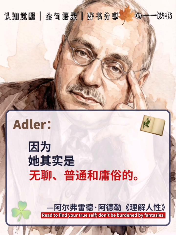 认知觉醒|金句语录|好书分享。 Adler:很多男性经常强行幻想,对面的女人是圣洁、高雅和善良的。 阿尔弗雷德·阿德勒《理解人性》:经常搞的被幻想的对象,非常不好意思。因为她其实是无聊、普通和庸俗的。不过对她来说,做不了真实的自己,那可是真累。于是,她只能装模作样的配合。