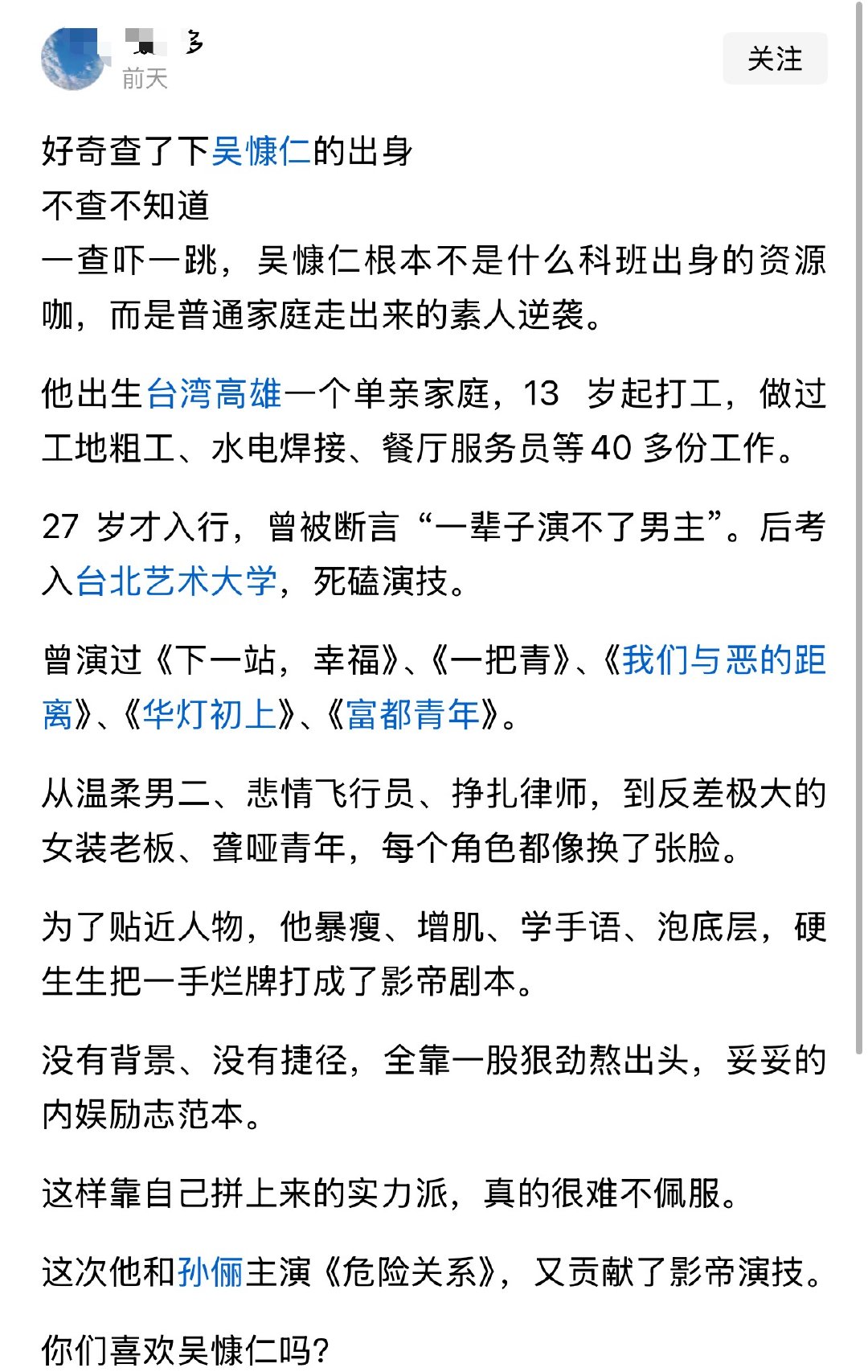 好奇查了下吴慷仁的出身不查不知道一查吓一跳