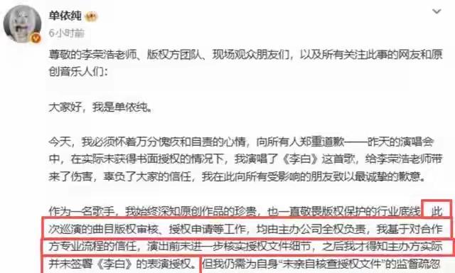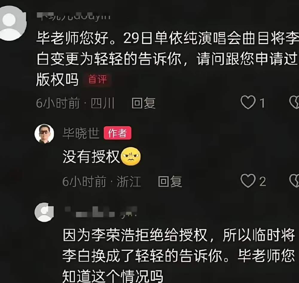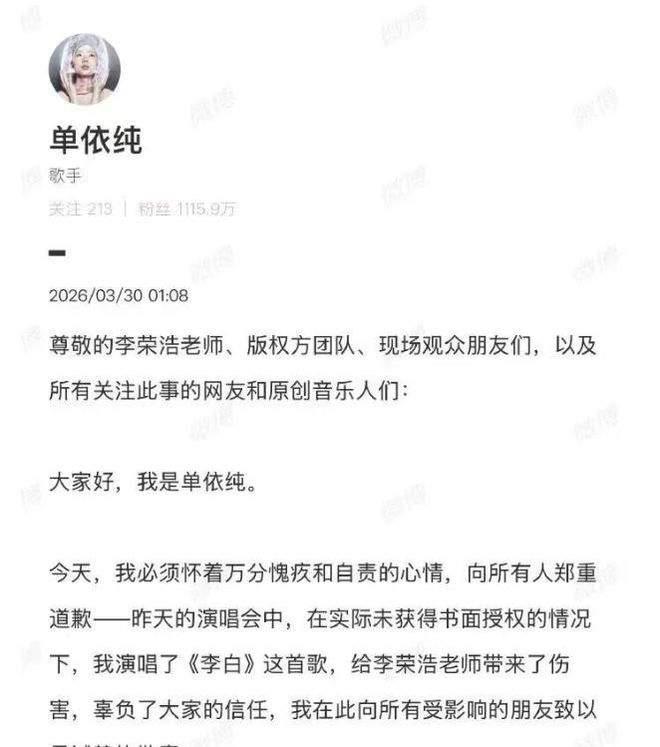 凭什么啊?李荣浩这口气,换谁都咽不下! 盯着电脑发邮件婉拒授权,转头就看见对方在深圳演唱会舞台上,大大方方唱着《李白》,换你是李荣浩,你气不气? 人家早就把话说死了,不让商演翻唱,单依纯团队也实打实收到了邮件,结果呢?照唱不误,这不纯纯贴脸开大嘛? 当初《歌手》上改词唱“又能怎”,李荣浩没计较,给足了情面,可这情分不是你肆意侵权的理由啊。 这完全是蹬鼻子上脸了! 一出事就说“刚了解情况,怪团队没审核清楚”,好家伙一句话就想把自己摘干净?拜托,你是歌手,什么歌能唱自己心里能没数?甩锅给谁看啊? 你想想,要是咱们辛辛苦苦做的东西,被人明着抢来用,道个歉就完事,那谁还愿意踏实干活是不是? 都说娱乐圈潜规则是先唱再补票,先侵权再道歉,但凭啥啊?维权的人耗时间耗精力,侵权的人零成本,这规矩凭啥不能破? 有人说李荣浩太较真,可这不是较真啊,是守底线啊!他要的从来不是钱,是原创者的尊严。 如果连原创版权都能被这么无视,以后谁还甘心埋头写歌?李荣浩金曲 如何看待单依纯李白舞台的高播放量