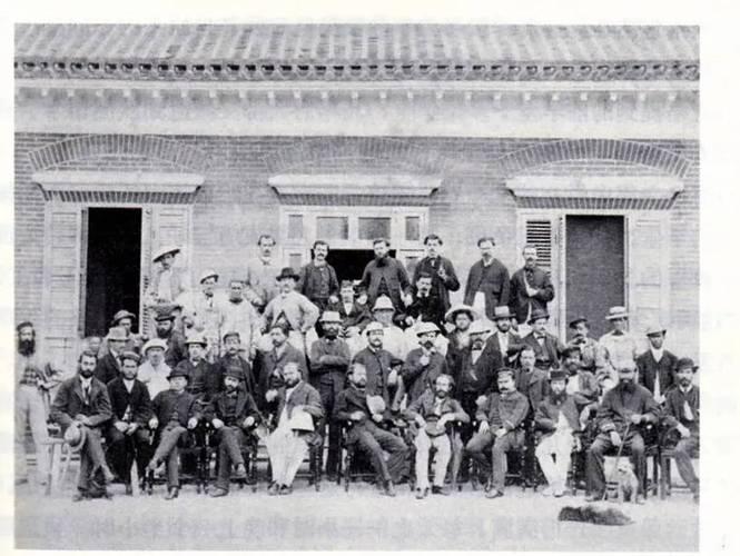 这张照片是19世纪70年代拍摄的马尾船政局外籍技术雇员集体合影。 他们身后是西式红砖建筑,是船政局厂区内专门为洋员修建的办公楼/宿舍。作为晚清远东最大的造船厂,船政局为了适配外籍技术人员的工作生活,专门打造了符合西方工业建筑风格的办公空间。 照片里三排都是白人男性,全是受清政府高薪聘请的洋员,松弛的姿态、右下角的小狗,他们的身份是船政局的技术雇员,涵盖造船工程师、轮机师、航海教官、船政学堂洋教习、翻译、医生等,核心负责人是法国海军军官日意格(正监督)、德克碑(副监督),这张合影几乎囊括了船政局初创期的核心洋员团队。 这些洋员和清政府签有极其严格的雇佣合同,以日意格为例,合同明确要求5年内必须教会中国工匠独立建造蒸汽军舰、驾驶轮船,培养出合格的中国技术人才,否则扣发全额薪水。船政局的所有权、人事权、财政权完全掌握在清政府手中,洋员仅负责技术传授。