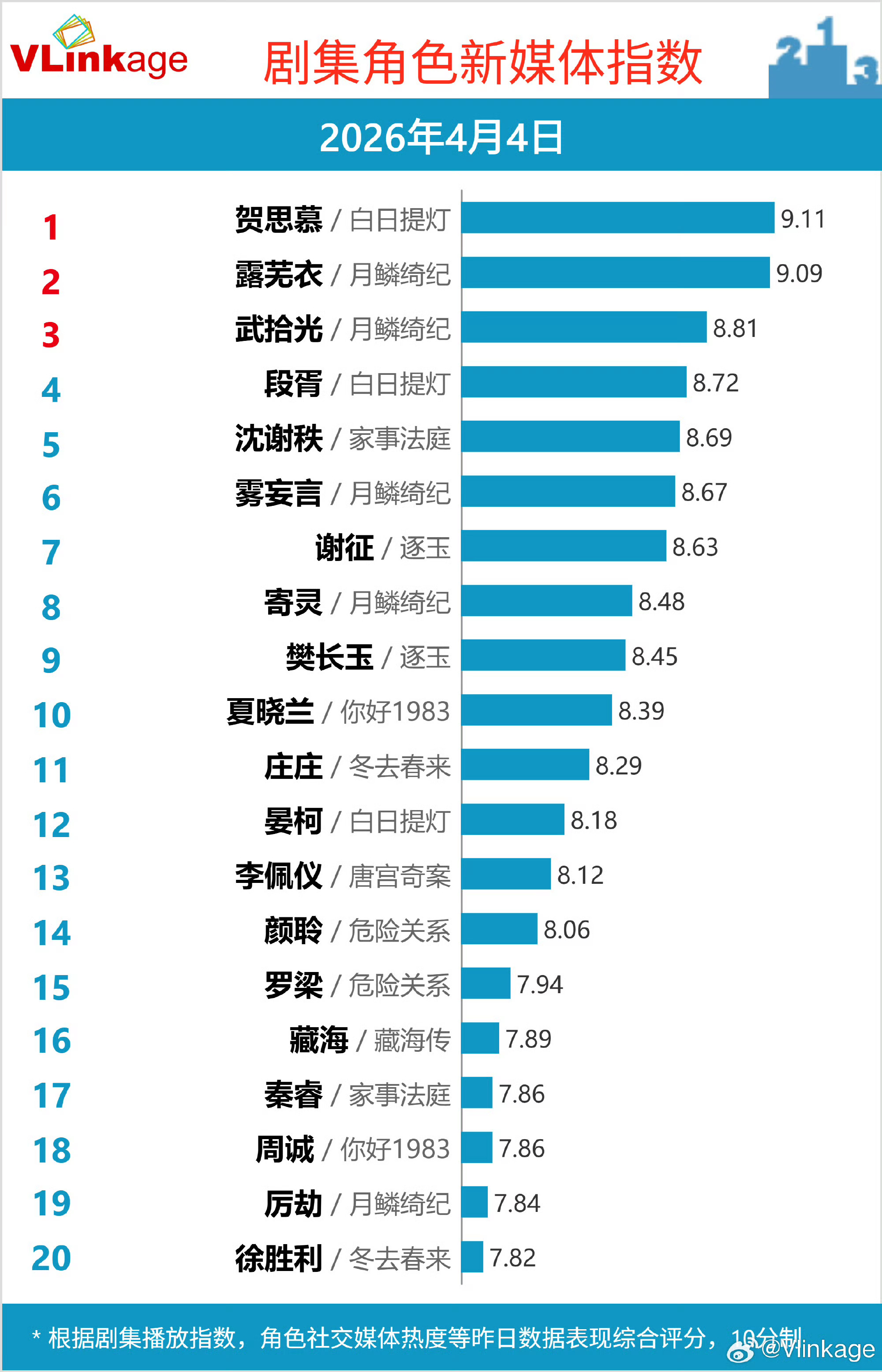 昨日剧集角色新媒体指数Top 20:贺思慕/白日提灯、露芜衣/月鳞绮纪、武拾光/月鳞绮纪、段胥/白日提灯、沈谢秩/家事法庭、雾妄言/月鳞绮纪、谢征/逐玉、寄灵/月鳞绮纪、樊长玉/逐玉、夏晓兰/你好1983分列前十。你们看了哪个