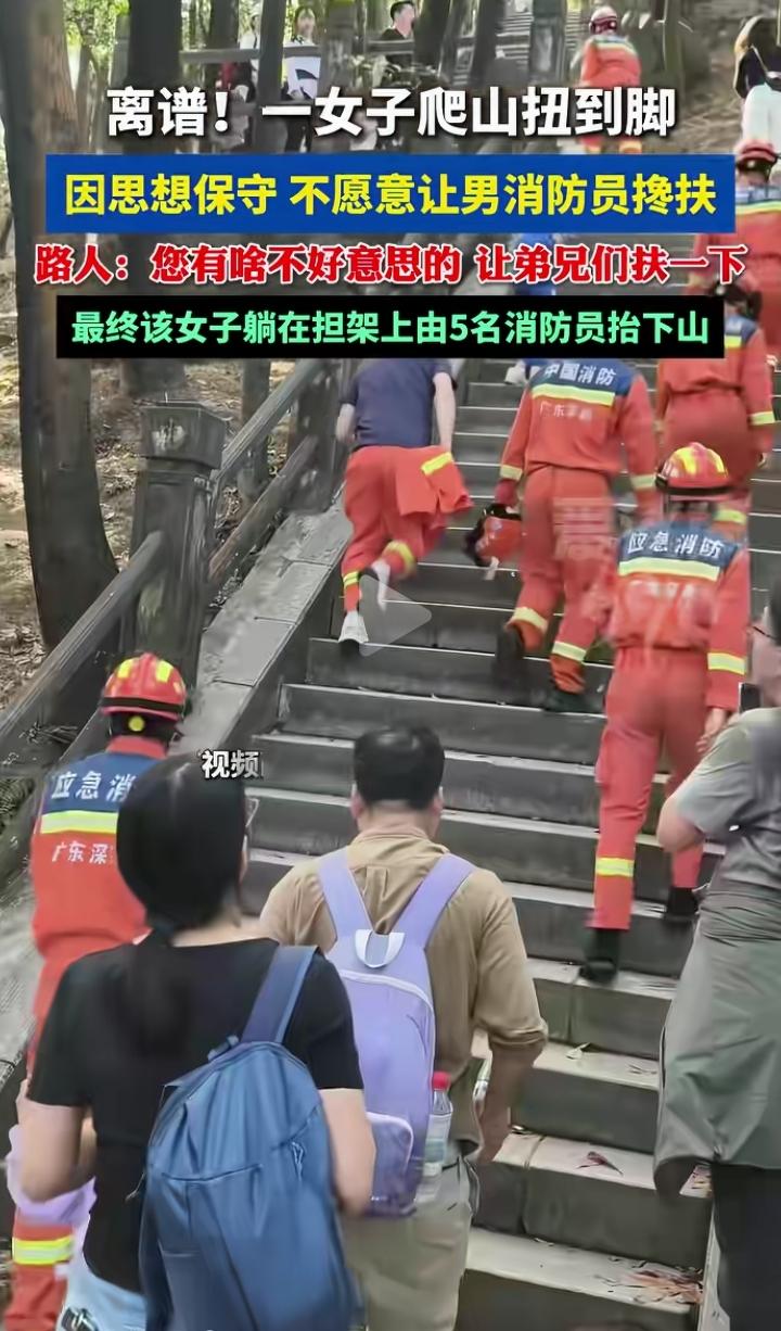 一女子爬山扭到脚,因思想保守不愿意让男消防员搀扶!最后没办法被5名消防员抬下山! 现在还有这么保守的女人?就怕是表面 是保守的思想,背后是开放的身体,结婚要传统的彩礼,日常要追求灵魂的自由!你千万别占全了,要不然那真的是奇葩!