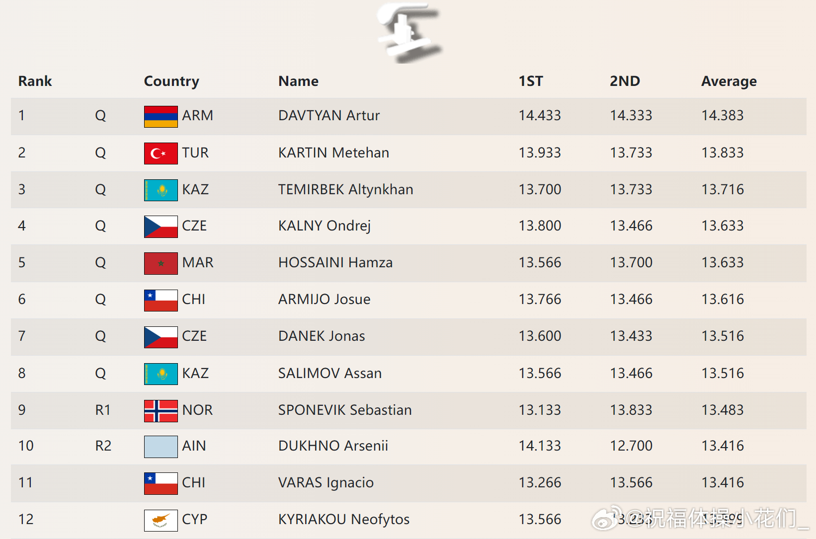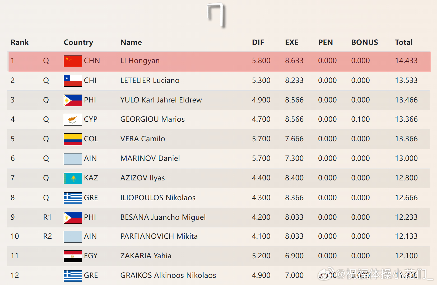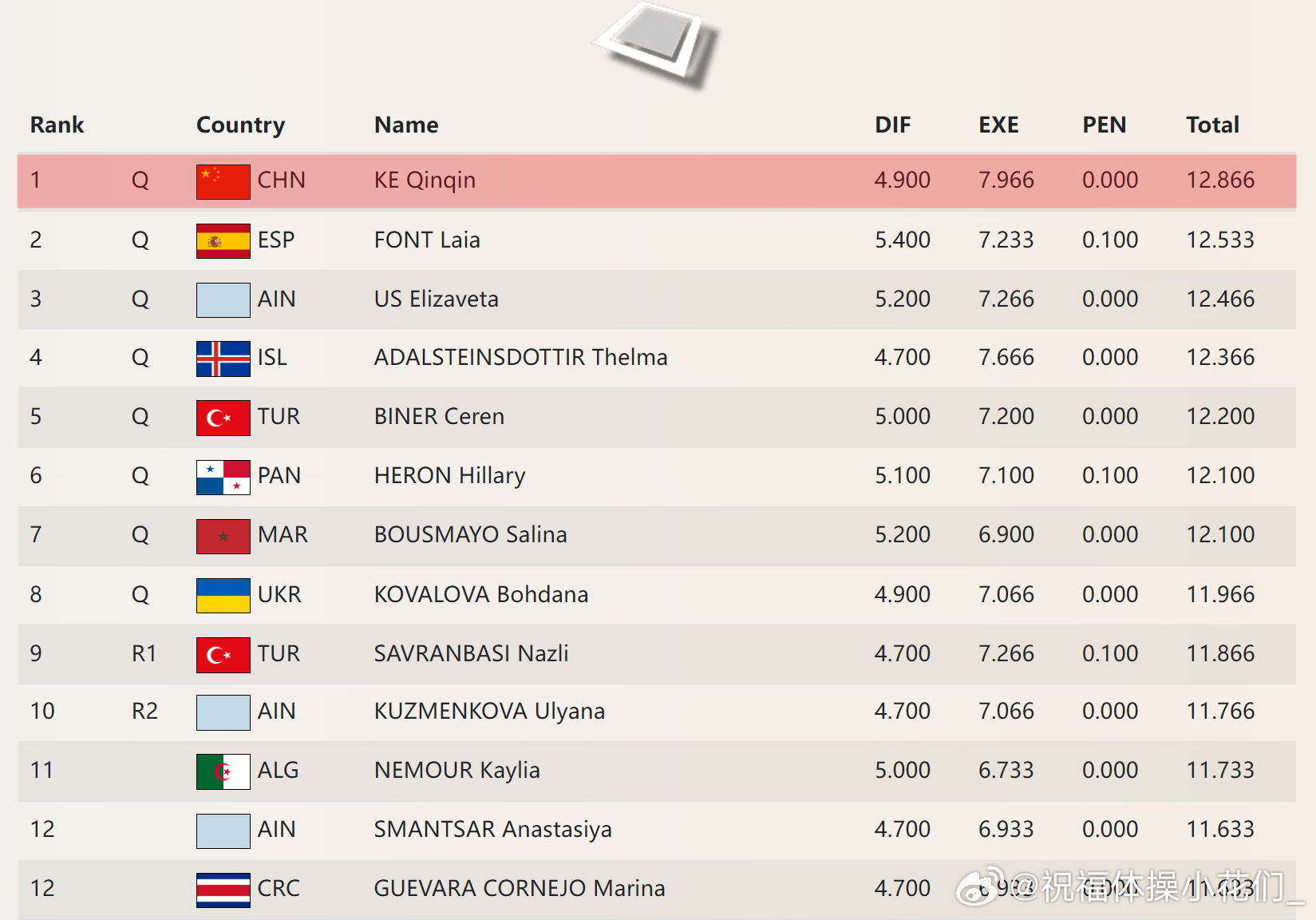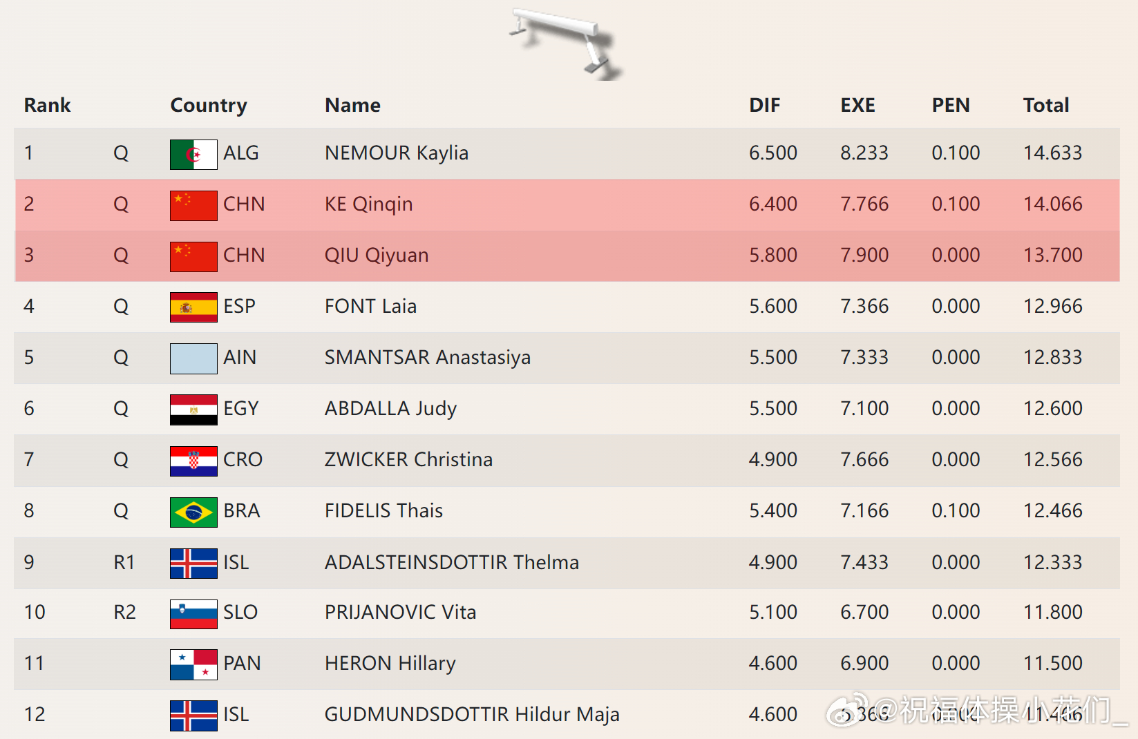 开罗站 资格赛第二天 中国队均顺利晋级:柯沁沁暂列自由操首位(4.9+7.966),同时还与邱祺缘分列预赛平衡木二三名(6.4+7.766-0.1,5.8+7.9)。刘洋与李鸿颜分别以双杠和单杠第一晋级决赛(5.6+9.066,5.8+8.633)。今天进入开罗站首个决赛日,今晚19点央视频将对比赛进行直播(搜索“体操”在直播栏可看到直播链接)。