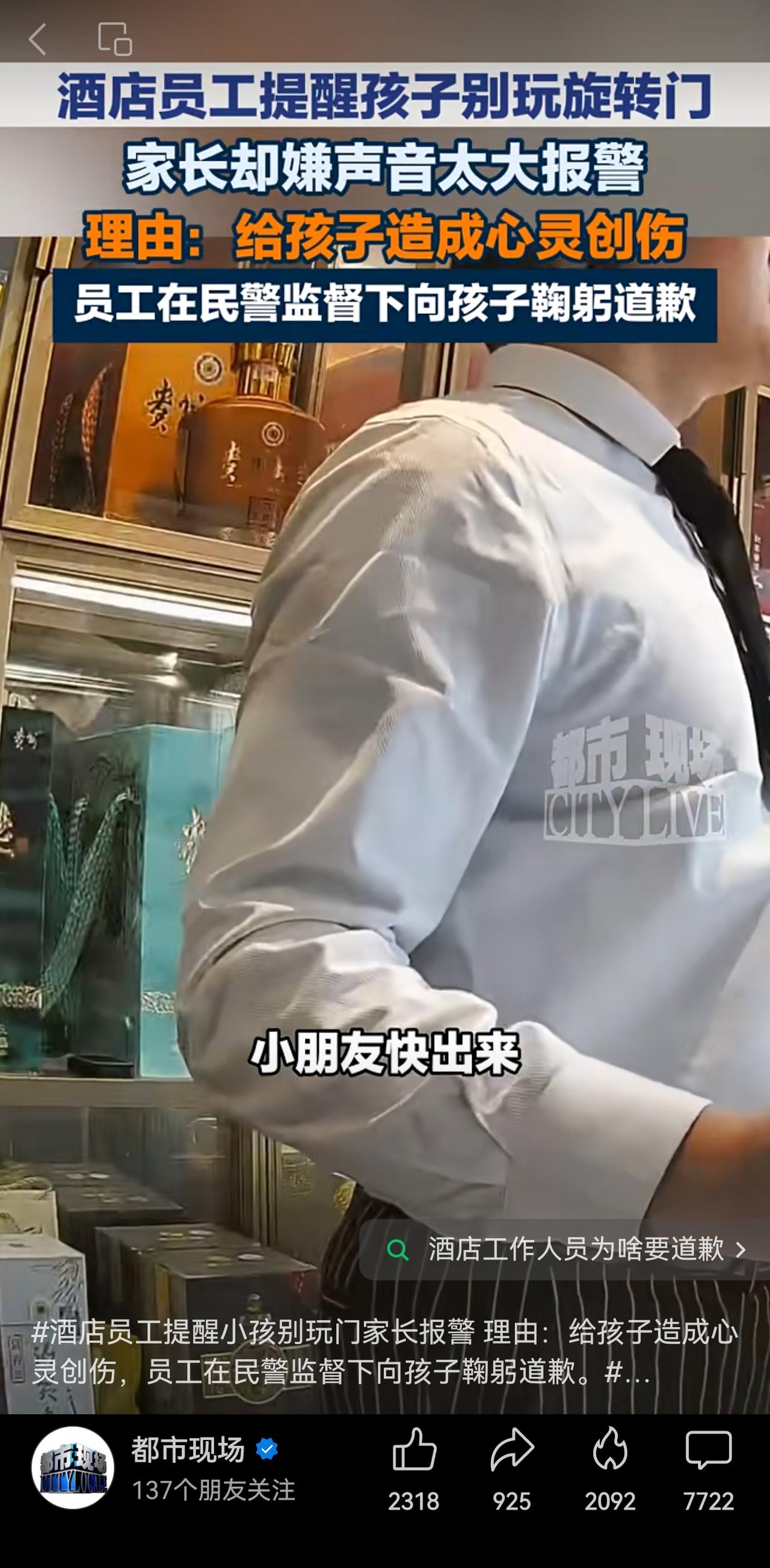 根据报道,这名员工是在民警监督下向小孩鞠躬道歉。那么,需要追问的是,处理此事的民警是不是也认为这名酒店员工喊“小朋友快出来”声音太大给孩子造成“心灵创伤”?民警这么处理是不是息事宁人? 因此,不要责怪家长胡搅蛮缠,纵容“熊孩子”,真正需要关注的是“和稀泥”处理。家长报警是其权利,而警方应该依法依规进行处理。如果酒店员工是出于孩子安全提醒,就不应要求员工给小孩道歉。而应该对家长进行严厉的批评教育。 同样,学校内的“校闹”问题,不也是纵容家长,“谁闹谁有理”造成的吗?