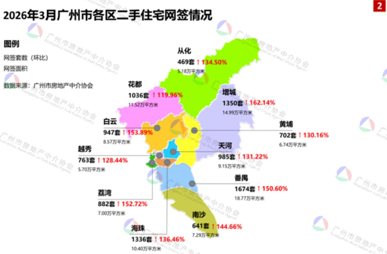 【全面暴涨!2026年3月关注二手住宅网签突破一万套】受2月份的传统春节假期影响交投冷清之后,3月份,广州二手成交迎来暴涨时刻!全市二手住宅网签突破一万套,环比增幅近1.5倍,各行政区表现均高度活跃。广州市二手住宅网签套数和面积分别为10785套、105.33万平方米,环比分别巨幅攀升141.38%和129.52%。 很多中介都又开始吹小阳春了!但是其实这次暴涨并不是行情变好,而只是上个月大跌之后的正常回归而已。 从各区网签套数环比来看,各区域增长幅度均超过一倍,其中增城区增幅高达162.14%,荔湾区、白云区和番禺区等多个区域增幅也都在150%以上。 回到南沙方面,南沙3月份二手网签641套,增长144.66%。但是从套数来看,依旧还是全市尾二的位置,还是仅能力压从化而已。 而更有趣的是,由于2月份跌幅过惨,相关机构都不敢标出环比跌幅的幅度,仅显示具体套数。而这次3月份暴涨回归之后,涨幅比又正常回归了!