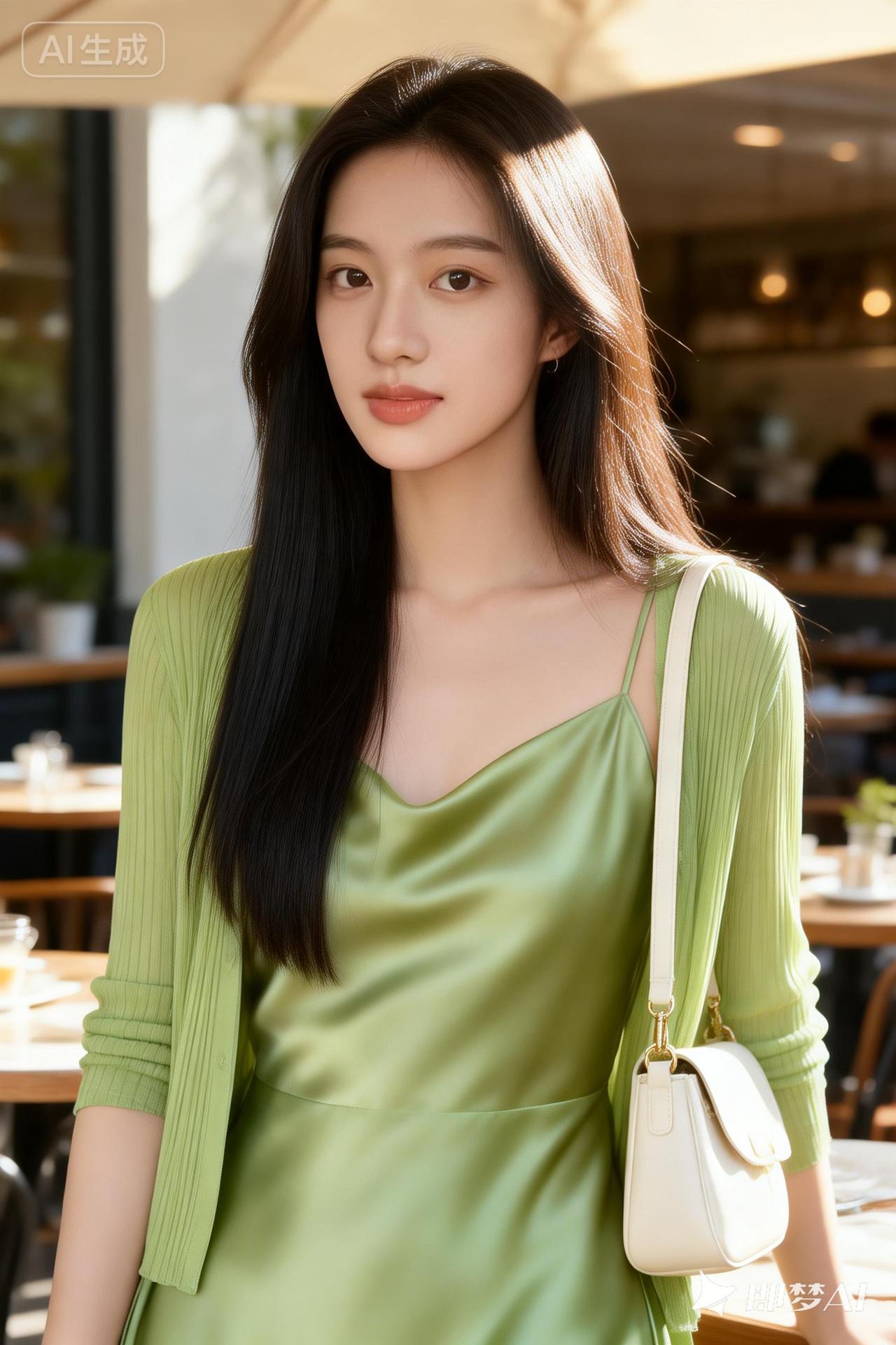 清新自然,优雅气质,绿色连衣裙搭配白色包包,完美呈现时尚与自然之美。
