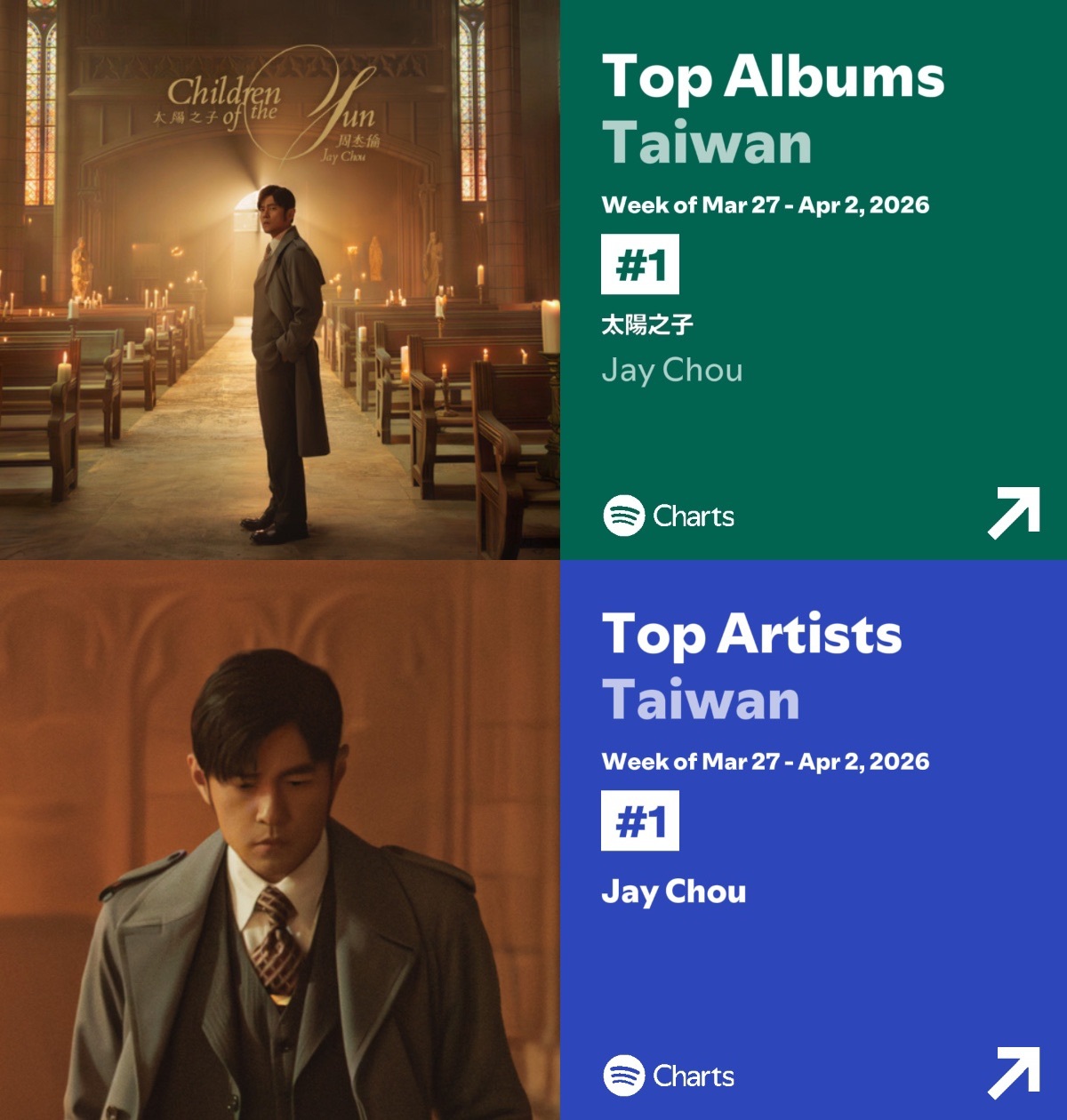 Spotify台湾周榜,周杰伦携新专辑《太阳之子》拿下歌手榜及专辑榜双榜冠军!