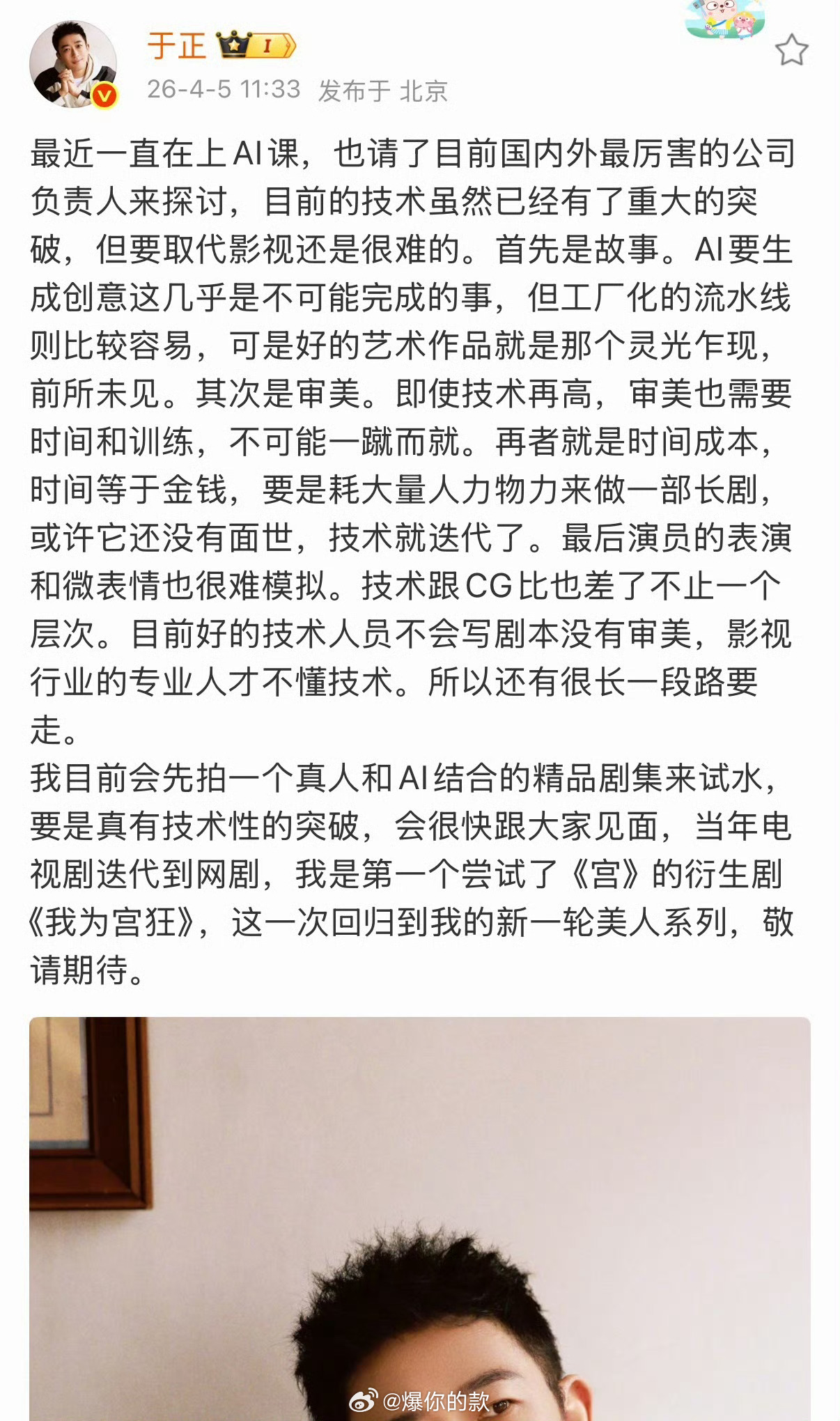 于正试水ai剧于正拍ai剧了 期待第一部“真AI+真人”剧集,不仅是技术的突破,
