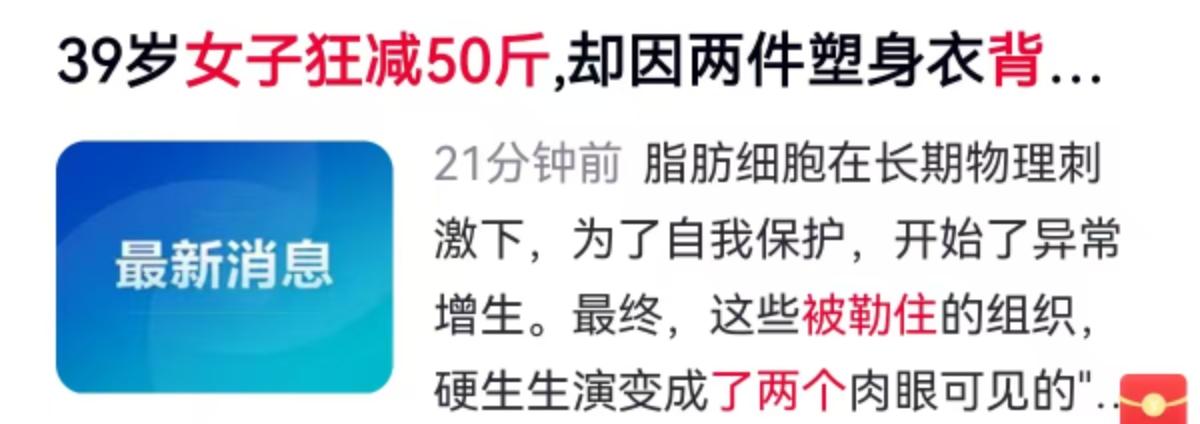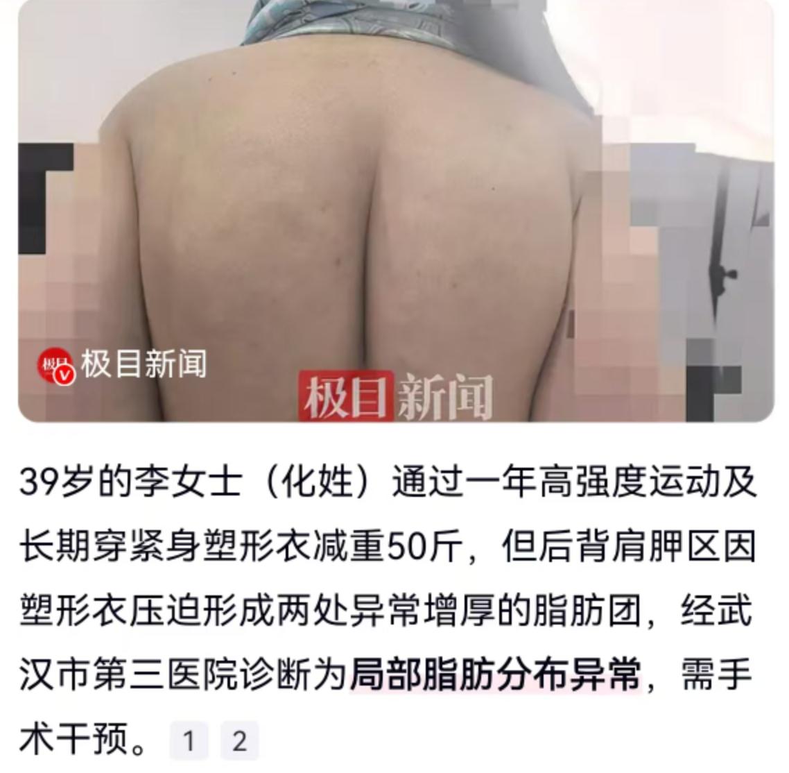 39岁的李女士(化姓)用一整年的时间,靠着高强度运动硬生生甩掉了50斤肥肉。这本该是一个标准的励志故事,直到她站在镜子前,发现后背肩胛骨的位置,莫名其妙鼓起了两个硬邦邦的肉疙瘩。去武汉市第三医院一做B超,数据把所有人都看愣了:左侧肩胛处脂肪层厚达4.3厘米,右侧也有4.0厘米。医生给出的诊断结果极其明确,局部脂肪分布异常,罪魁祸首就是她这一年里长期穿着的紧身塑形衣。 这绝不是简单的“肉松了”。很多想减肥的人都有个执念,以为运动的时候把自己裹得严严实实,出更多的汗,脂肪就能被“勒”没。李女士显然也是这种理论的信徒。人体的脂肪细胞远比人们想象的要聪明且倔强。在长达一年的时间里,肩胛区遭受着塑形衣持续不断的高强度物理压迫。局部血液循环受阻,正常的脂肪代谢通道被强行切断。面对这种恶劣的生存环境,脂肪细胞触发了自我保护机制,开始异常增生,甚至出现纤维化趋势。原本该随着全身减重而缩小的脂肪,硬生生在被勒得最紧的地方,堆砌成了两个异常增厚的脂肪团。 人民网科普中国早在2019年就反复科普过一个常识:塑形衣不是减肥衣。它唯一能做的,只是通过外力把脂肪挤压到其他地方,制造出一种视觉上的平直假象。脱下衣服,脂肪立刻打回原形。李女士的遭遇,把这种“掩耳盗铃”的代价具象化了。她不仅没勒出好身材,反而给自己背上了需要手术干预的硬包袱。 针对这两个4厘米多厚的异常脂肪团,医生给出的治疗方案是吸脂手术。这听起来像个简单的抽吸动作,实际操作难度极大。背部脂肪的纤维隔结构非常致密,跟腹部那种松软的脂肪完全不是一个概念。强行用器械在里面穿插抽吸,极易造成出血或凹凸不平。为了追求体型的完美,先让自己吃苦受累减重50斤,接着又要在背上动刀子去修补被勒出来的畸形,这笔健康账怎么算都亏得厉害。 这起发生在武汉的就诊案例,撕开了减肥市场里最大的一个谎言。市面上各种材质的塑身衣、束腰、保鲜膜,打着“暴汗燃脂”“物理塑形”的旗号,本质上都是在收智商税。物理学定律决定了,外力挤压绝对不可能让脂肪凭空消失。出汗减掉的只是水分,喝两杯水马上就会长回来。长期紧勒带来的,只有皮肤缺氧、毛囊炎、胃肠受压消化不良,以及像李女士这样破坏底层脂肪代谢结构的严重后果。 想要真正改变体型,没有任何捷径可走。医生给出的科学减重建议永远是那最朴素的两条:饮食控制加上适度运动。管住嘴制造热量缺口,迈开腿提高基础代谢。哪怕这个过程需要半年、一年甚至更久,减下来的是实打实的真瘦,身体的内分泌和脂肪分布也是处于健康平衡的状态。 别再迷信那些勒得人喘不过气的紧身衣了。把花钱买塑形衣的预算拿去换几双好跑鞋,把穿脱塑形衣挣扎的时间拿去做几组力量训练。身体是一台极其精密的仪器,你用温和科学的方式对待它,它就会给你流畅的线条;你用暴力压迫的方式虐待它,它必定会以更难看的方式报复回来。李女士背上的那两道手术印,理应成为所有减肥者戒掉“速成幻觉”的清醒剂。 以上内容仅供参考和借鉴