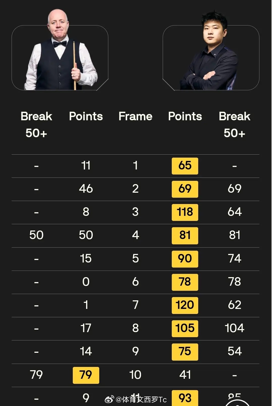 第二阶段比赛,赵心童上来状态依旧在线打出单杆54分总分75-14率先拿下第9局直接拿到赛点9-0领先希金斯,第10局,赵心童率先进攻打出单杆41分出现失误,很明显赵心童是有意放水一局,希金斯也是抓住机会打出单杆79分扳回一局,第11局,赵心童轰出单杆85分再也没有给希金斯机会了,直接完成终结比赛10-1战胜希金斯晋级决赛。恭喜赵心童本赛季第三次杀入决赛!