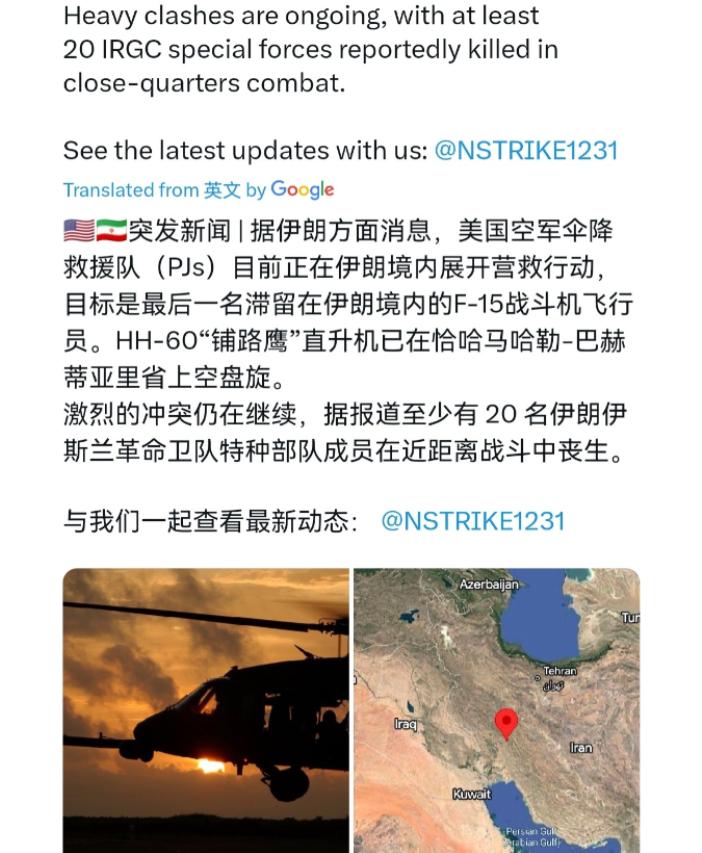遭遇美国特种部队,伊朗革命卫队死战不退!超过 20 名革命卫队成员战死!4 月 5 日,外媒报道称,美国空军伞降救援队员(PJ)正在伊朗境内展开行动,营救 F-15 战机的一名幸存飞行员。 HH-60 “铺路鹰” 直升机已在恰哈马哈勒-巴赫蒂亚里省上空投入行动。 而伊朗革命卫队与美国的特种部队发生激烈交火,据报道,伊朗伊斯兰革命卫队已有至少 20 人在近距离作战中阵亡。 很显然,从冲突的情况来看,这可能意味着美军特种部队已经接近飞行员位置,美国为实施最后的救援发动了强攻。 这场发生在伊朗腹地的近距离激战,绝非一次普通的敌后搜救任务,而是美伊多轮对抗持续升级后的集中爆发,也把美国在中东的军事冒险与战略纠结彻底暴露在世人面前。 事情的起点要追溯到 4 月 3 日凌晨,美军一架 F-15E “打击鹰” 双座战机在伊朗中部科吉卢耶-博韦艾哈迈德省空域执行任务时,被伊朗革命卫队的国产霍尔达德 - 15 防空系统精准击落,这是本轮美伊对抗以来,伊朗首次成功击落美军有人驾驶战机,两名机组人员弹射逃生后落入地形复杂的扎格罗斯山区,一场围绕被俘飞行员的生死争夺,从那一刻起就正式打响。 为了抢回飞行员,美军几乎动用了敌后搜救的全套顶配力量,以空军伞降救援队这支精锐特战力量为核心,搭配 HH-60 “铺路鹰” 搜救直升机、F-35A 隐身战机、A-10 攻击机提供空中掩护,还有 HC-130J 搜救运输机负责远程补给与通信保障,甚至在约旦、沙特境内搭建了空中加油走廊,多架战略加油机随时待命,试图以绝对的空中优势完成跨境救援。 但伊朗方面从战机被击落的第一时间就迅速反应,革命卫队联合当地部族武装封锁了坠机周边百公里范围,展开拉网式搜捕,不给美军任何从容施救的机会,此前美军派出的两架搜救直升机就曾在伊朗山区被地面火力击中,被迫仓促撤离,4 月 5 日的这场强攻,正是美军在多次试探受阻后,不得不铤而走险的无奈选择,而伊朗革命卫队以死战不退的姿态正面硬刚,用血肉之躯阻击美军特战力量,也让这场救援从单纯的战术行动,变成了关乎双方国家颜面与军事意志的激烈较量。 美国不惜冒着冲突全面升级的风险,派特种部队深入伊朗本土发动强攻,绝不是单纯为了救回一名军人那么简单,背后藏着清晰的国内政治与地区战略算计。 从国内层面来看,特朗普政府近期在中东军事行动接连受挫,F-15E 被击落已经重创了美军标榜的军事威信,若是飞行员被伊朗活捉,势必会成为伊朗手中的重磅外交筹码,不仅会让美国在美伊谈判中陷入彻底被动,还会引发美国国内民众对政府中东政策的强烈质疑,甚至影响到军方与政坛的舆论走向,白宫急需一场 “成功的特战救援” 来掩盖战机被击落的军事失利,向国内民众展示美军的战斗力,稳住国内的舆论阵脚。 从地区战略层面来看,美国在中东的盟友体系正面临前所未有的松动,伊朗的防空体系与反击能力经过多年发展,早已不是可以任由美军随意拿捏的状态,美军需要通过这次跨境救援行动,向沙特、以色列等中东盟友释放信号,强调自己依旧有能力在敌后展开军事行动,维系在中东的军事威慑力,避免盟友对美国的保护能力失去信心,进而动摇美国苦心经营的中东同盟体系。 伊朗革命卫队宁愿付出 20 人阵亡的代价,也要死战不退阻击美军救援,同样是基于国家主权捍卫与地区博弈的双重考量。 伊朗始终坚守领空与领土不可侵犯的核心底线,美军战机擅自闯入伊朗空域执行任务,本身就是对伊朗主权的公然侵犯,被伊朗防空系统击落属于合理合法的自卫行动,而美军特种部队跨境进入伊朗本土发动强攻,更是对伊朗主权的二次践踏,伊朗必须以强硬的反击姿态捍卫国家尊严,绝不给美国留下肆意侵犯他国领土的先例。 同时伊朗也十分清楚,美国既想在中东维持霸权地位,又不敢轻易发动全面地面战争,毕竟美伊两个地区军事大国一旦爆发全面对抗,不仅会让整个中东陷入全面战乱,还会直接冲击霍尔木兹海峡的能源运输安全,引发全球油价剧烈波动,美国自身的经济与战略利益也会遭受重创,所以伊朗选择用地面近战的方式拖住美军,既不主动将冲突升级为全面战争,又牢牢掌握着博弈的主动权,让美国陷入打不得、退不得的两难境地。 美国在这次救援行动中的一系列操作,再次暴露了其中东政策 “既要又要” 的自我矛盾怪圈。 一方面,美国并不希望与伊朗爆发全面冲突,担心战事扩大会拖累国内经济,分散其全球战略部署的精力;另一方面,美国又不甘心放弃中东霸权,始终试图用军事施压、特战冒险、空中打击等方式逼迫伊朗妥协,维护自己在中东的主导地位。