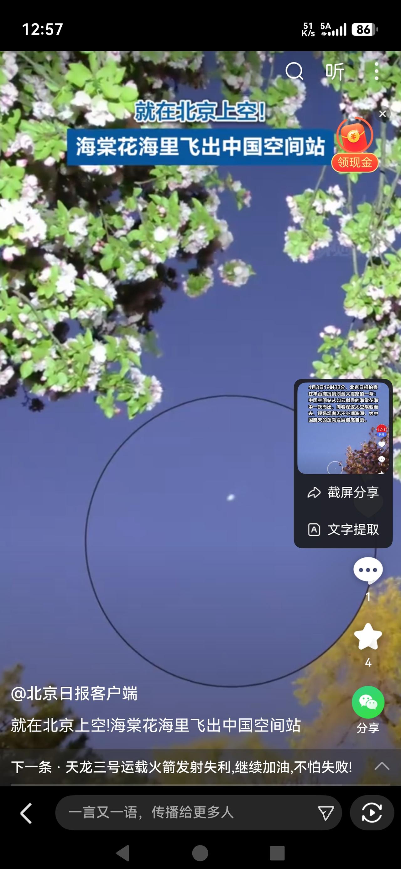 《海棠花海邂逅中国空间站!这幕“硬核浪漫”,看哭亿万国人》 4月3日19时33分,北京丰台夜空澄澈,摄影师定格震撼瞬间:中国空间站如金色飞梭,从如云似霞的海棠花海中腾空掠过,奔赴星河。这是人间春色与大国航天的绝美同框,春日繁花象征烟火人间,空间站承载星辰征途,一柔一刚、一近一远,定格中国式浪漫,全网刷屏引发全民自豪。 这张照片之所以破圈,是因为它戳中了每个中国人心底最柔软的骄傲。我们爱春日海棠的温柔,更爱中国航天的硬核底气。一边是人间烟火、岁岁花开,一边是逐梦苍穹、探索未知,这就是我们的家国浪漫:脚下有繁花,眼里有星河。 有人说,这是最美的中国式相遇。海棠开了一年又一年,空间站飞了一程又一程,从东方红到天宫号,中国人把浪漫写进太空,把安稳留在大地。没有凭空而来的惊艳,只有一代代航天人默默坚守,才让我们能在春风里仰望星空,在繁花中见证强国步伐。 这一幕告诉我们:浪漫不分高低,梦想不分远近。平凡生活里有诗意,大国征途上有荣光。我们既能欣赏人间四月天,也能奔赴浩瀚宇宙行。这就是中国,温柔且坚定,浪漫又强大。 愿我们如海棠般向阳生长,如航天般勇攀高峰,在自己的轨道上,绽放属于自己的光芒。