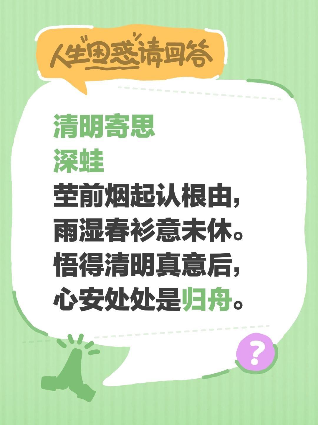 清明寄思 深蛙 茔前烟起认根由, 雨湿春衫意未休。 悟得清明真意后, 心安处处是归舟。